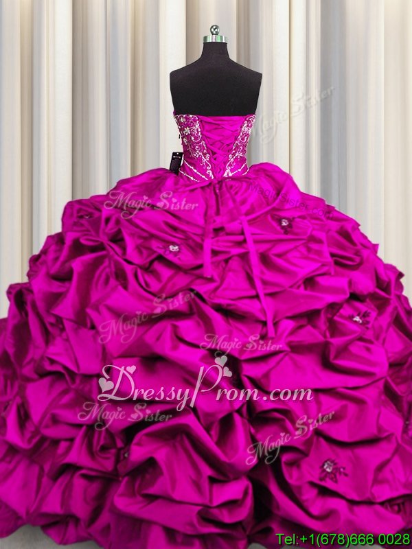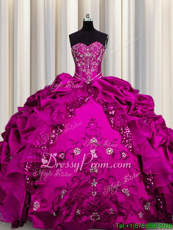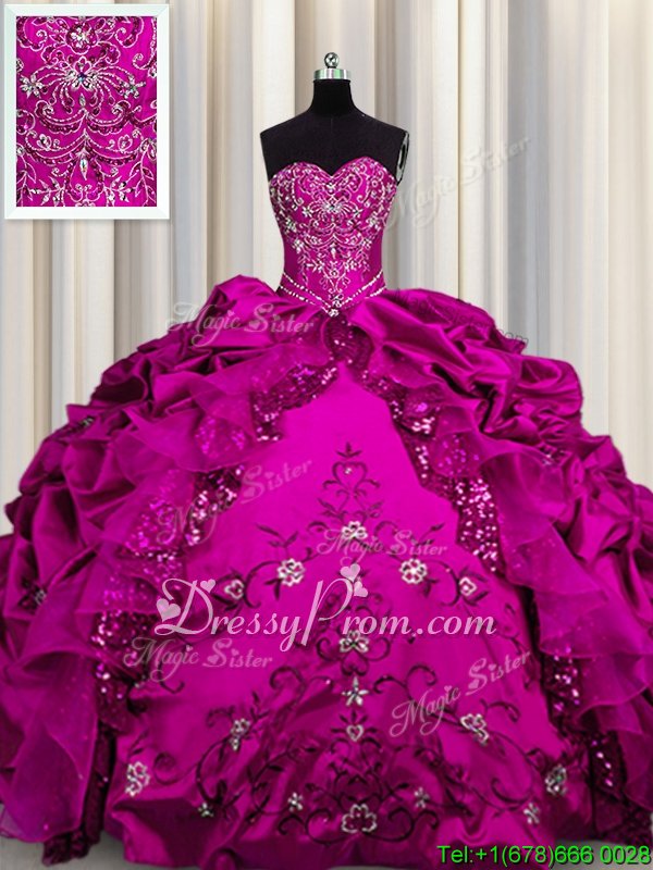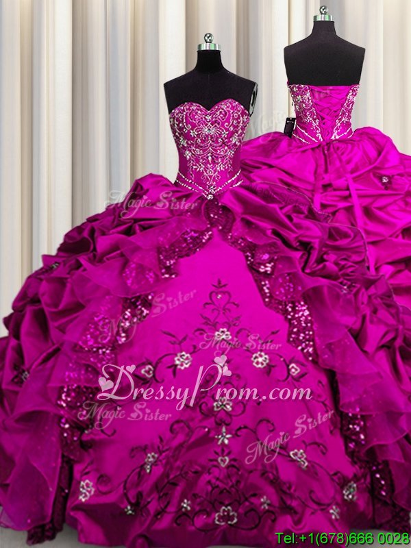 Neckline : SweetheartShown Color : FuchsiaSilhouette : Ball GownsSleeve Length : sleevelessHemline : floor lengthBack Detail : Lace upFabric : TaffetaEmbellishment : Beading,Embroidery,RufflesOccasion : Military Ball,Sweet 16,QuinceaneraSeason : Spring,Summer,Fall,Winter