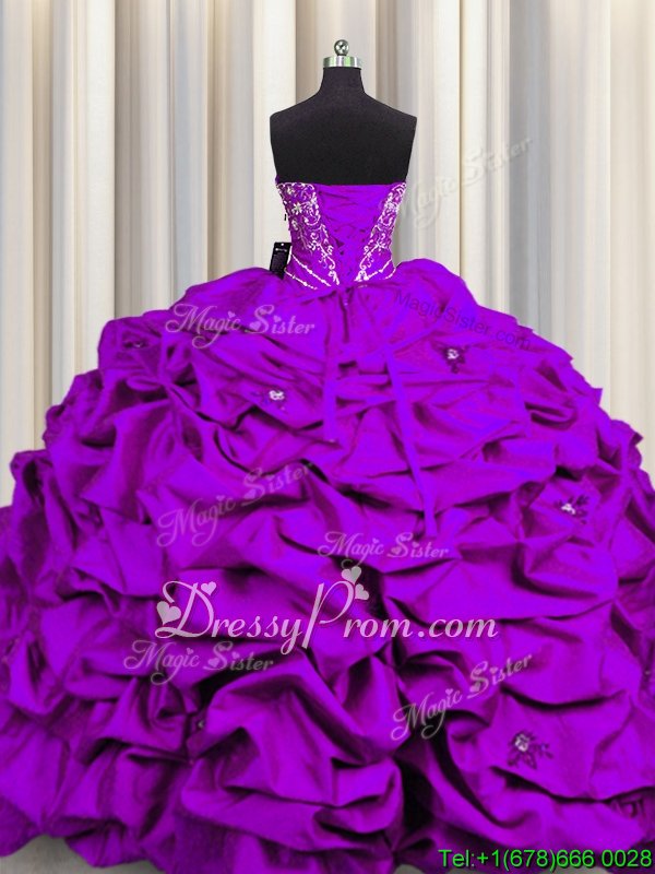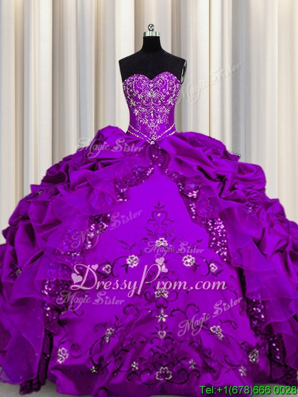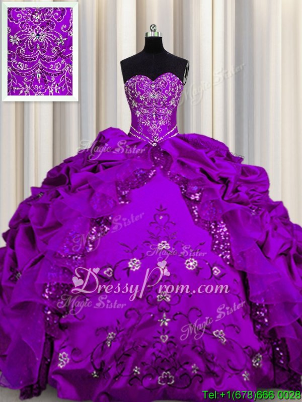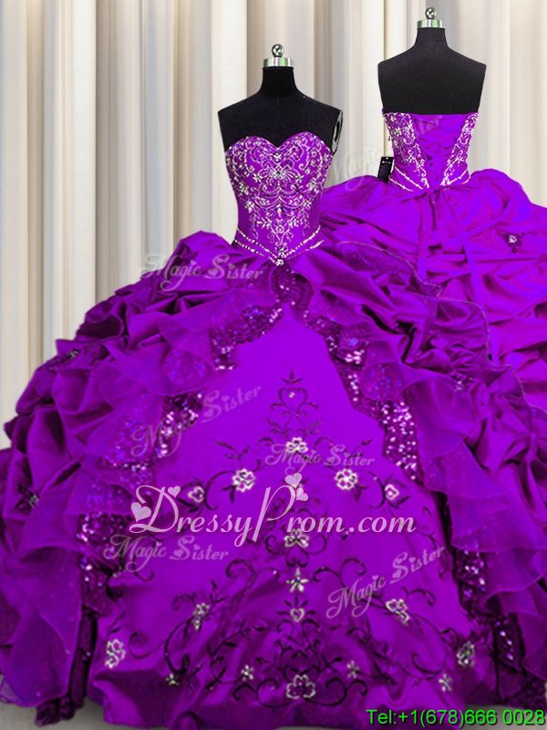 Neckline : SweetheartShown Color : PurpleSilhouette : Ball GownsSleeve Length : sleevelessHemline : floor lengthBack Detail : Lace upFabric : TaffetaEmbellishment : Beading,Embroidery,RufflesOccasion : Military Ball,Sweet 16,QuinceaneraSeason : Spring,Summer,Fall,Winter