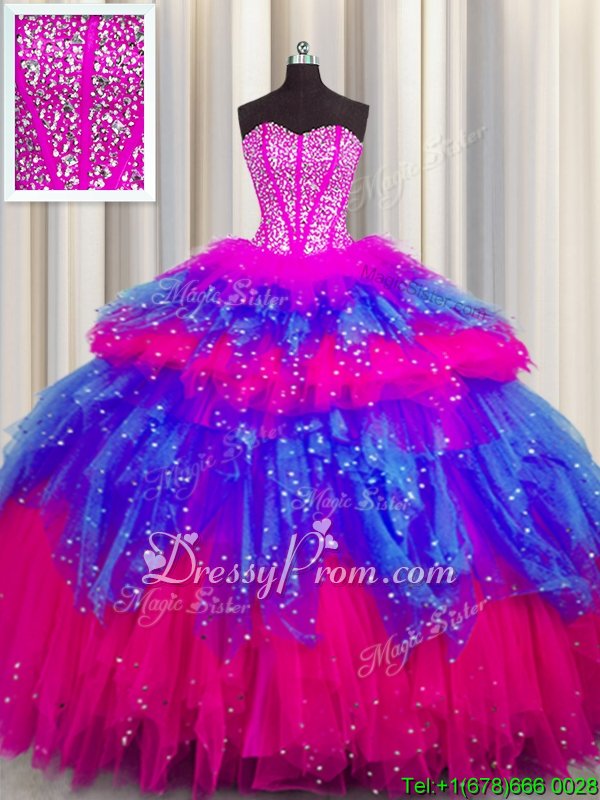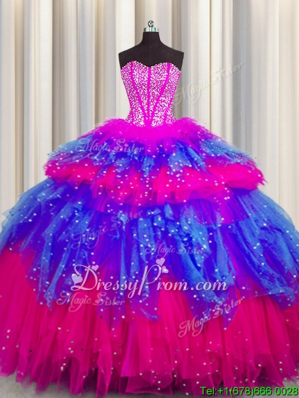 Glittering Tulle Sweetheart Sleeveless Lace Up Beading and Ruffles and Ruffled Layers and Sequins Vestidos de Quinceanera inMulti-color