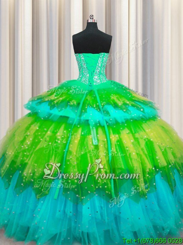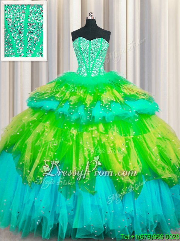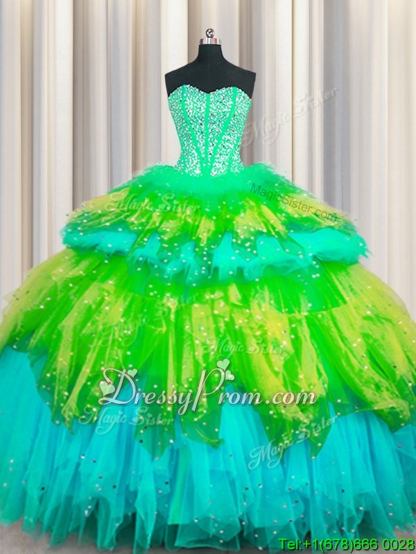 Extravagant Floor Length Multi-color 15 Quinceanera Dress Tulle Sleeveless Spring and Summer and Fall and Winter Beading and Ruffles and Ruffled Layers and Sequins