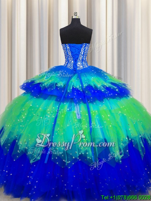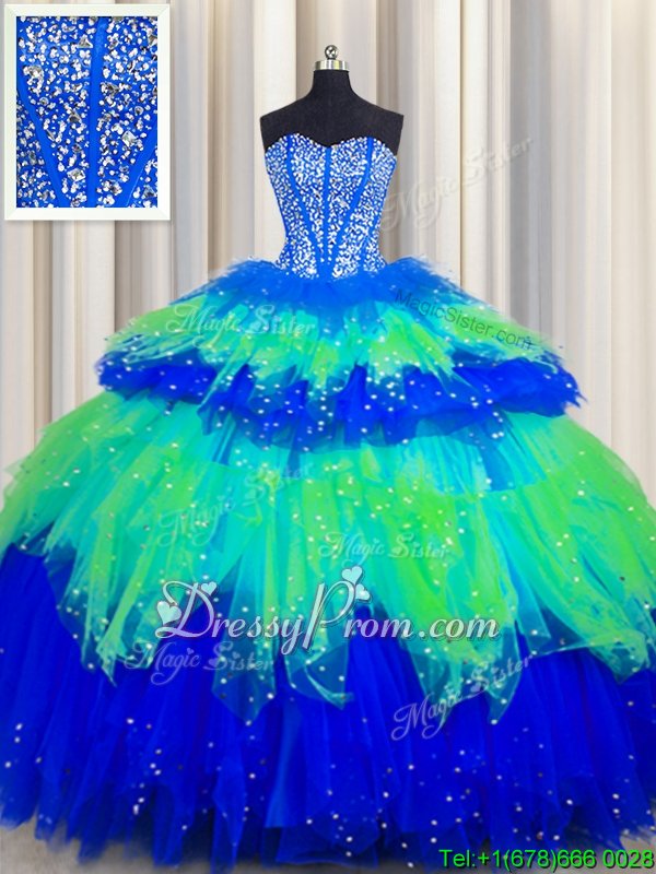 Ideal Floor Length Multi-color Quinceanera Gowns Tulle Sleeveless Spring and Summer and Fall and Winter Beading and Ruffles and Ruffled Layers and Sequins