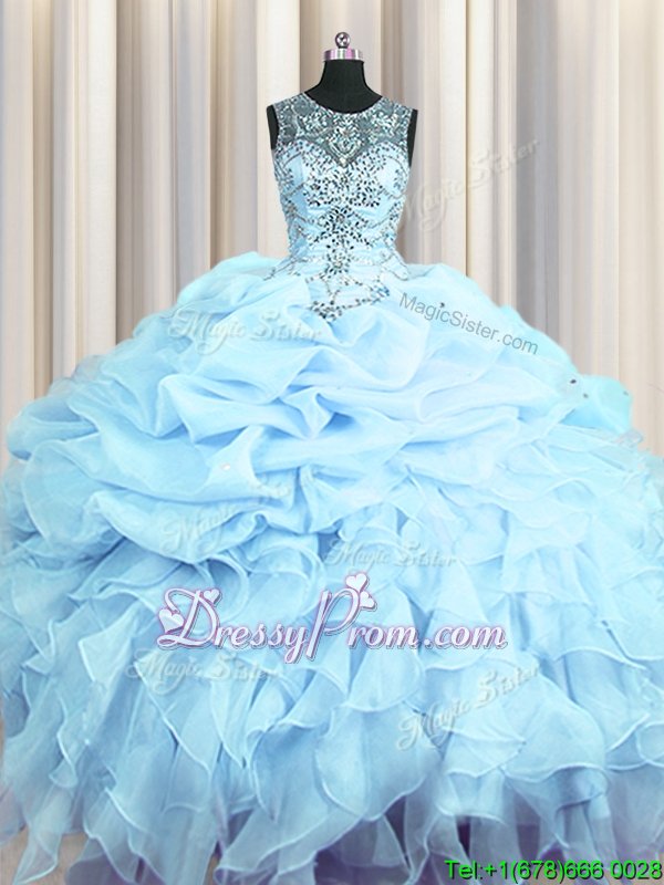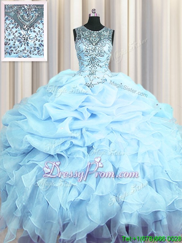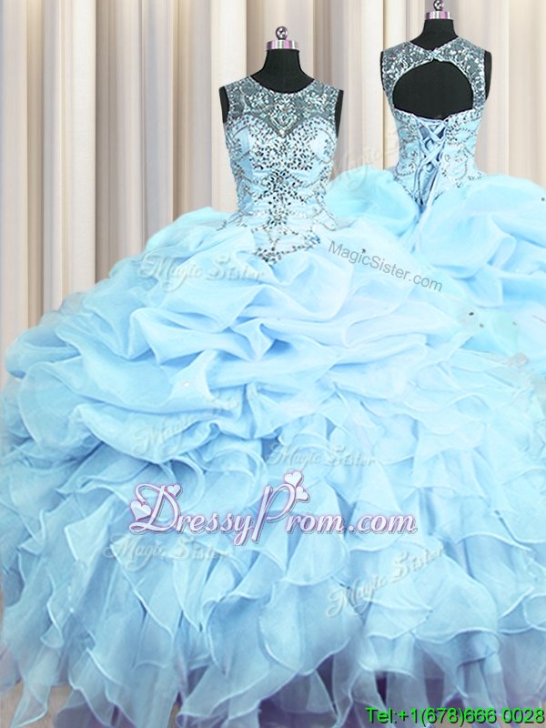 Neckline : ScoopShown Color : Light BlueSilhouette : Ball GownsSleeve Length : sleevelessHemline : floor lengthBack Detail : Lace upFabric : OrganzaEmbellishment : Beading,Ruffles,Pick UpsOccasion : Military Ball,Sweet 16,QuinceaneraSeason : Spring,Summer,Fall,Winter