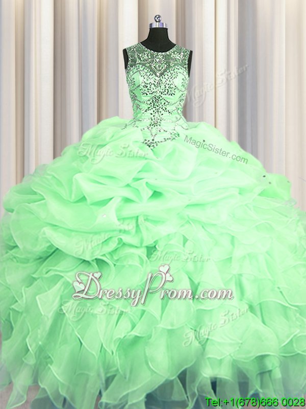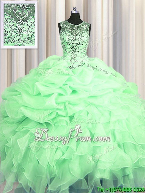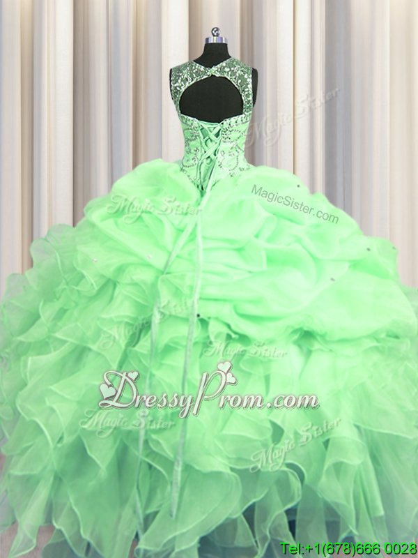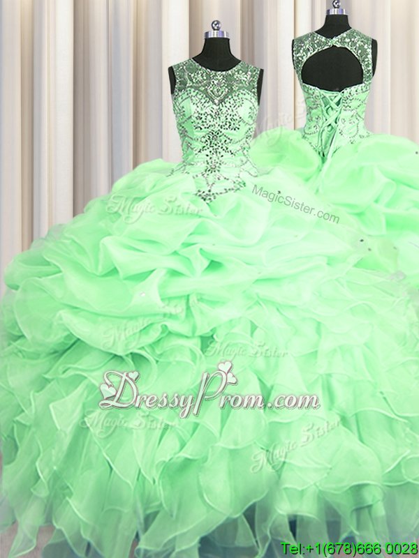 Neckline : ScoopShown Color : Apple GreenSilhouette : Ball GownsSleeve Length : sleevelessHemline : floor lengthBack Detail : Lace upFabric : OrganzaEmbellishment : Beading,Ruffles,Pick UpsOccasion : Military Ball,Sweet 16,QuinceaneraSeason : Spring,Summer,Fall,Winter