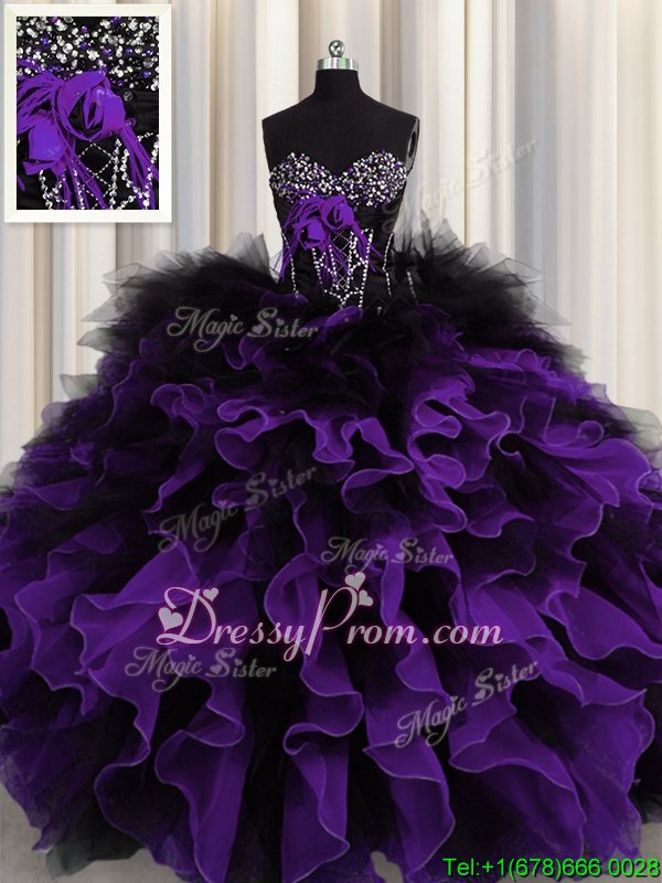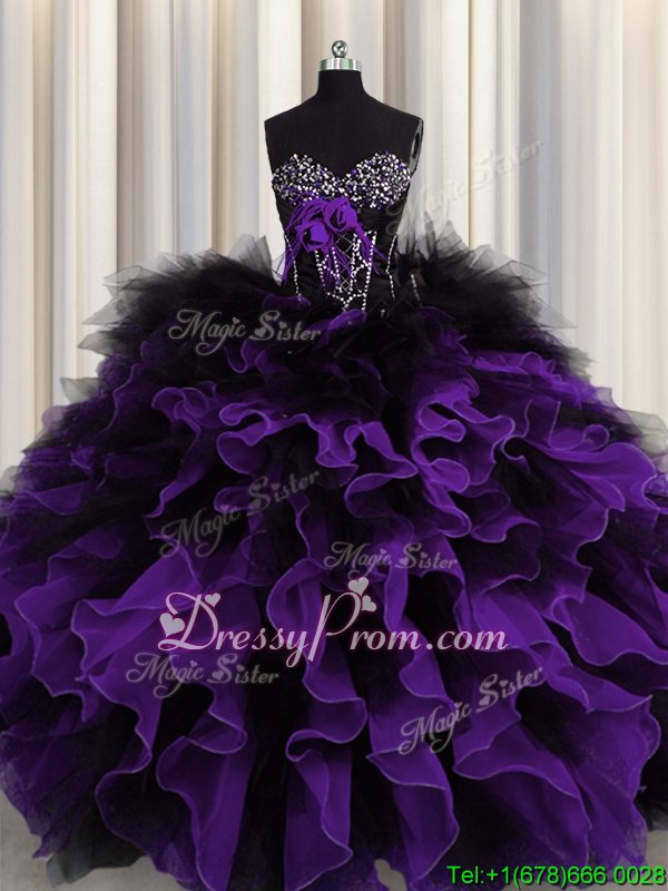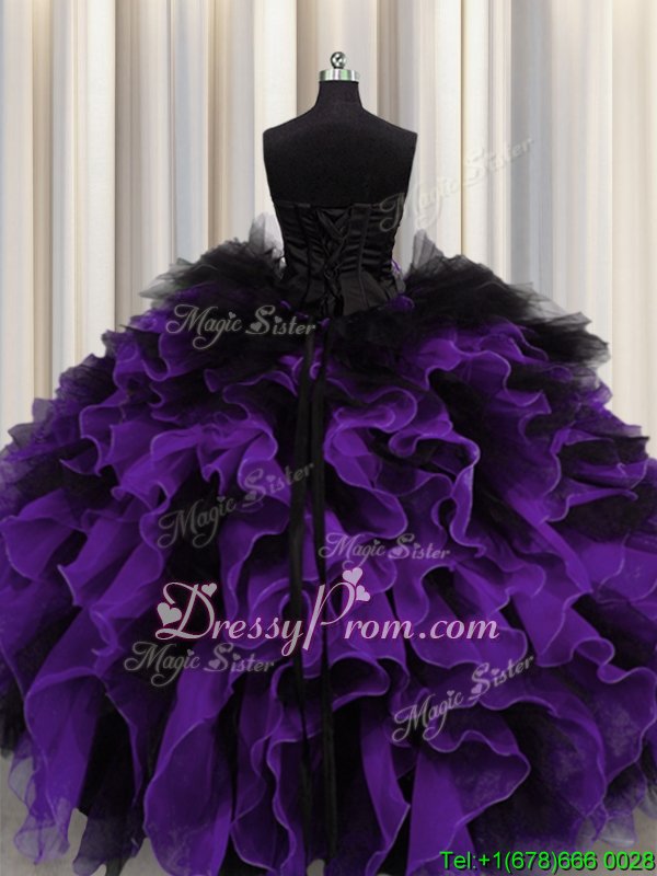 Designer Black And Purple Ball Gowns Beading and Ruffles Sweet 16 Quinceanera Dress Lace Up Organza Sleeveless Floor Length