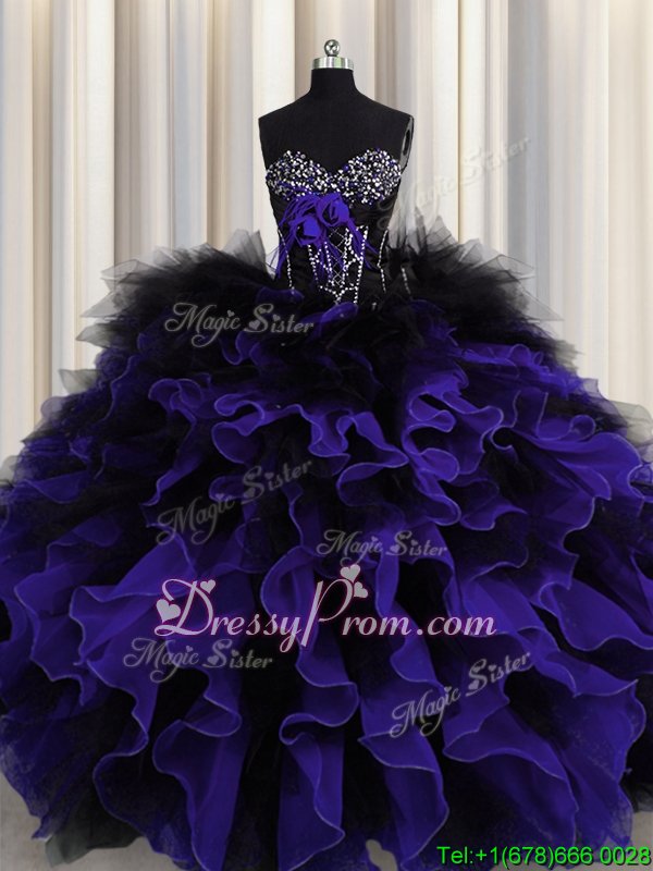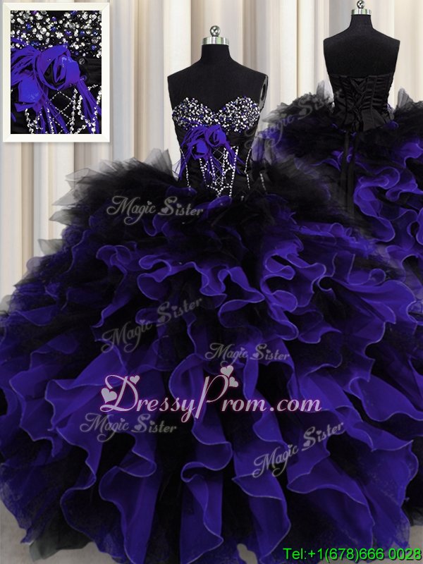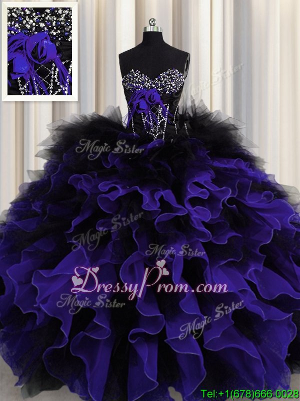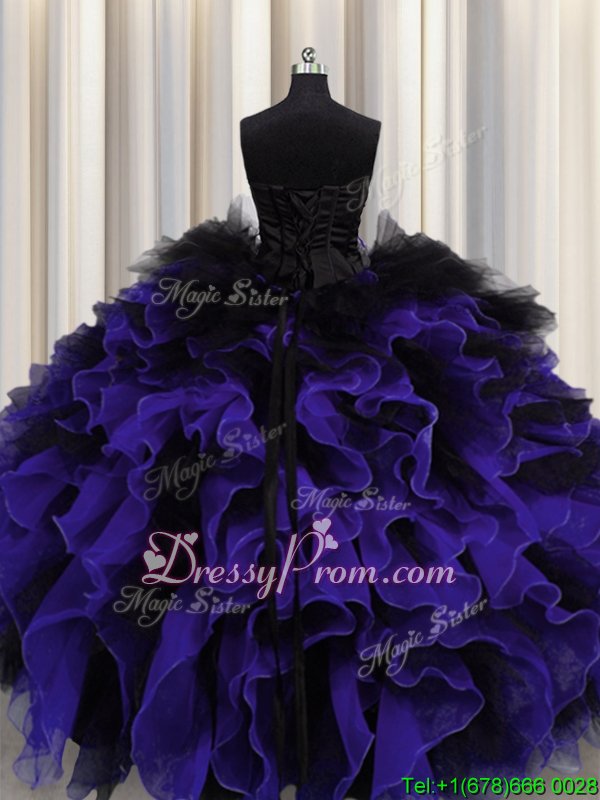 Neckline : SweetheartShown Color : Black And Purple Silhouette : Ball GownsSleeve Length : sleevelessHemline : floor lengthBack Detail : Lace upFabric : OrganzaEmbellishment : Beading,RufflesOccasion : Military Ball,Sweet 16,QuinceaneraSeason : Spring,Summer,Fall,Winter