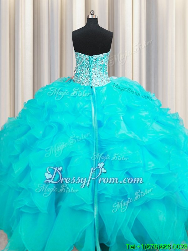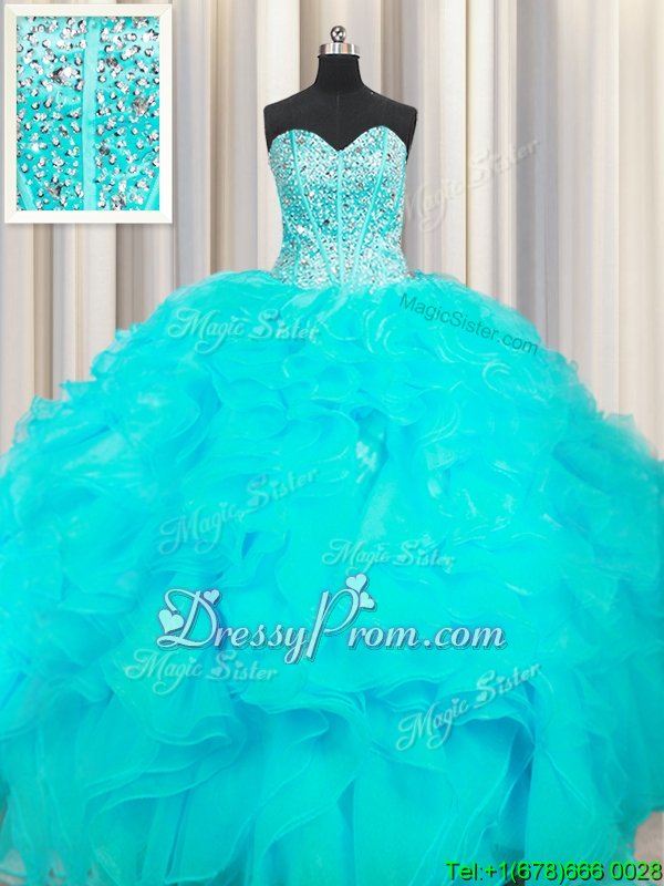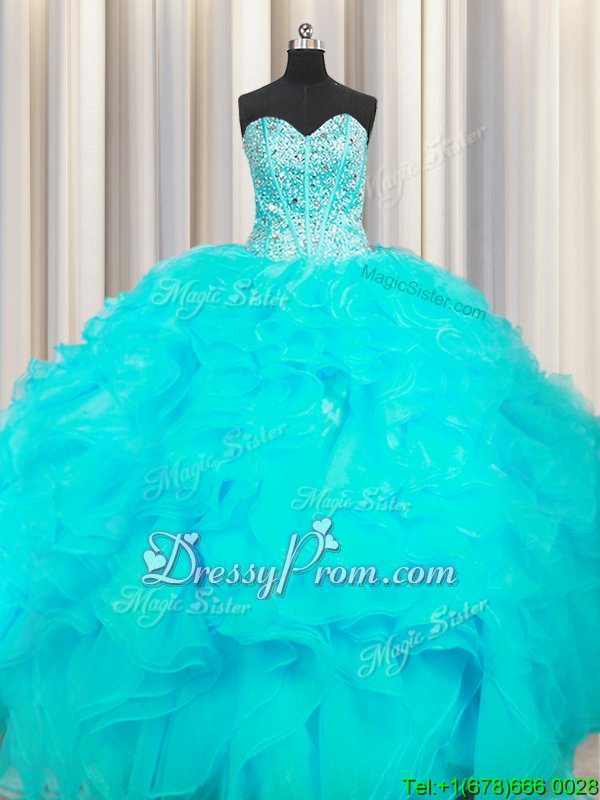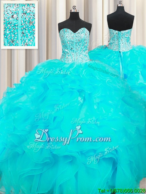 Neckline : SweetheartShown Color : Aqua BlueSilhouette : Ball GownsSleeve Length : sleevelessHemline : floor lengthBack Detail : Lace upFabric : OrganzaEmbellishment : Beading,RufflesOccasion : Military Ball,Sweet 16,QuinceaneraSeason : Spring,Summer,Fall,Winter