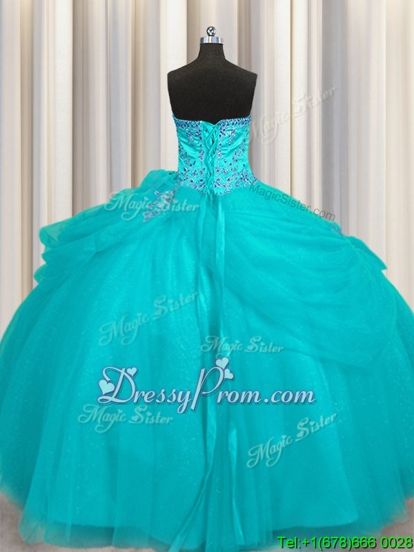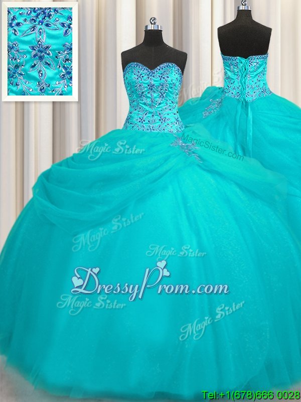 Dramatic Sweetheart Sleeveless Sweet 16 Quinceanera Dress Floor Length Beading Aqua Blue Organza