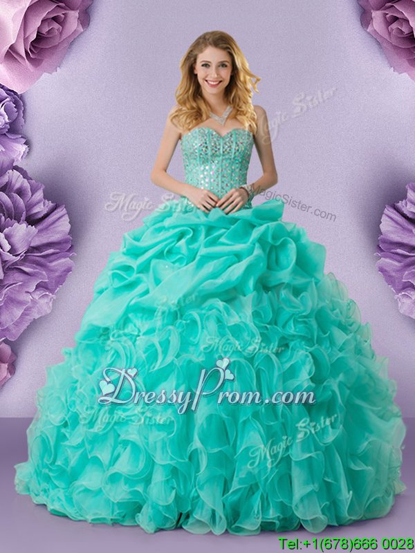 Neckline : SweetheartShown Color : TurquoiseSilhouette : Ball GownsSleeve Length : sleevelessHemline : floor lengthBack Detail : Lace upFabric : OrganzaEmbellishment : Beading,Ruffles,Pick UpsOccasion : Military Ball,Sweet 16,QuinceaneraSeason : Spring,Summer,Fall,Winter