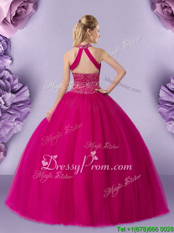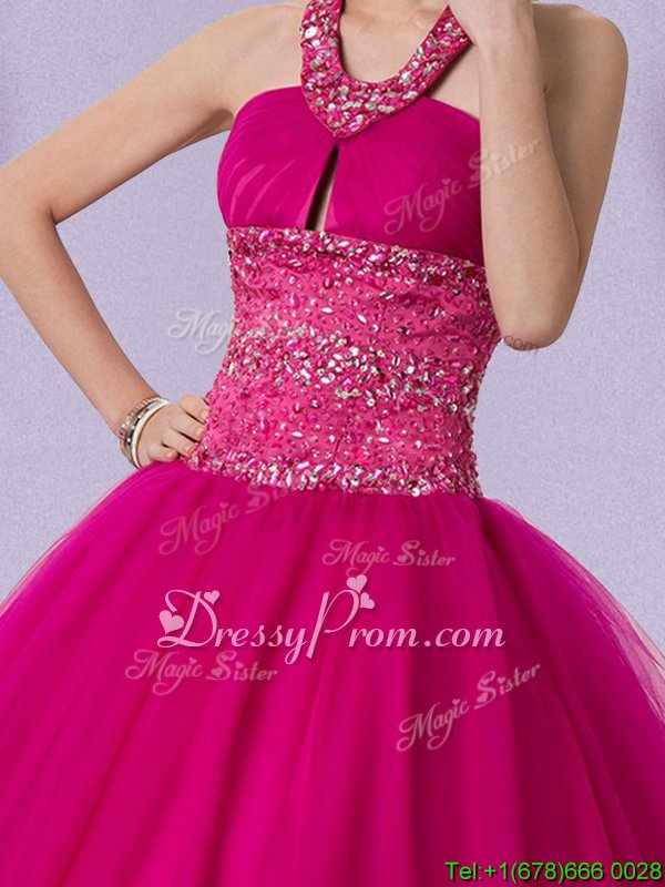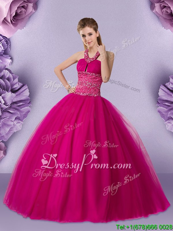 Neckline : Halter topShown Color : FuchsiaSilhouette : Ball GownsSleeve Length : sleevelessHemline : floor lengthBack Detail : Lace upFabric : TulleEmbellishment : BeadingOccasion : Military Ball,Sweet 16,QuinceaneraSeason : Spring,Summer,Fall,Winter