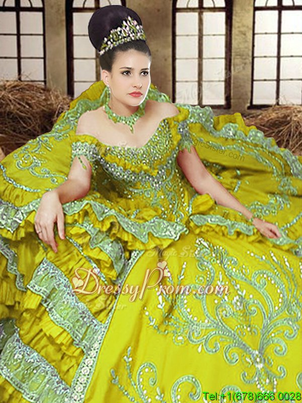 Neckline : Off the shoulderShown Color : Light YellowSilhouette : Ball GownsSleeve Length : sleevelessHemline : floor lengthBack Detail : Lace upFabric : SatinEmbellishment : EmbroideryOccasion : Military Ball,Sweet 16,QuinceaneraSeason : Spring,Summer,Fall,Winter