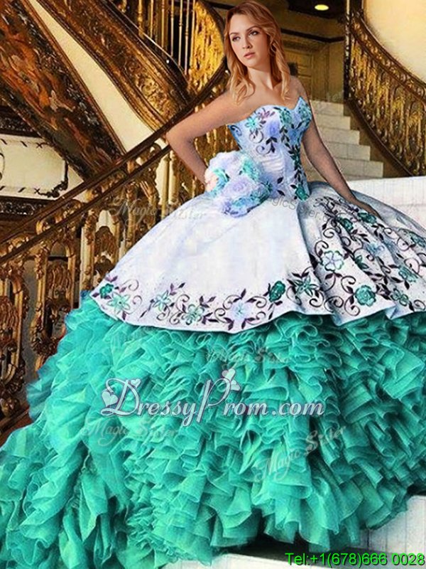 Neckline : SweetheartShown Color : White,TurquoiseSilhouette : Ball GownsSleeve Length : sleevelessHemline : floor lengthBack Detail : Lace upFabric : OrganzaEmbellishment : Appliques,EmbroideryOccasion : Military Ball,Sweet 16,QuinceaneraSeason : Spring,Summer,Fall,Winter