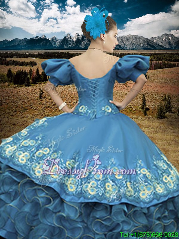 Neckline : Off the shoulder Shown Color : Blue Silhouette : Ball Gowns Sleeve Length : short sleeves Hemline : floor length Back Detail : Lace up Fabric : Organza Embellishment : Appliques,Ruffles Occasion : Military Ball,Sweet 16,Quinceanera Season : Spring,Summer,Fall,Winter