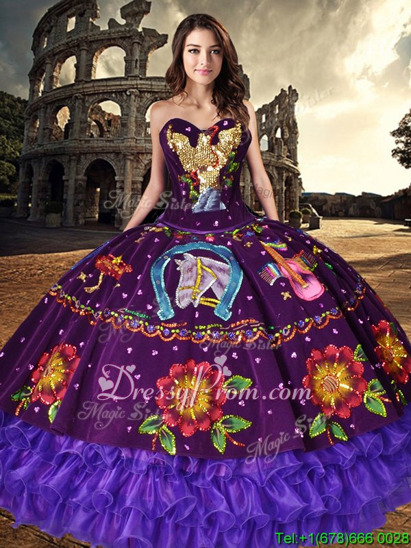 Neckline : SweetheartShown Color : PurpleSilhouette : Ball GownsSleeve Length : sleevelessHemline : floor lengthBack Detail : Lace upFabric : Organza,TaffetaEmbellishment : Embroidery,Ruffled LayersOccasion : Military Ball,Sweet 16,QuinceaneraSeason : Spring,Summer,Fall,Winter