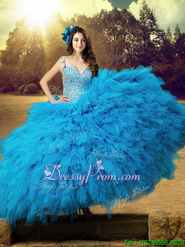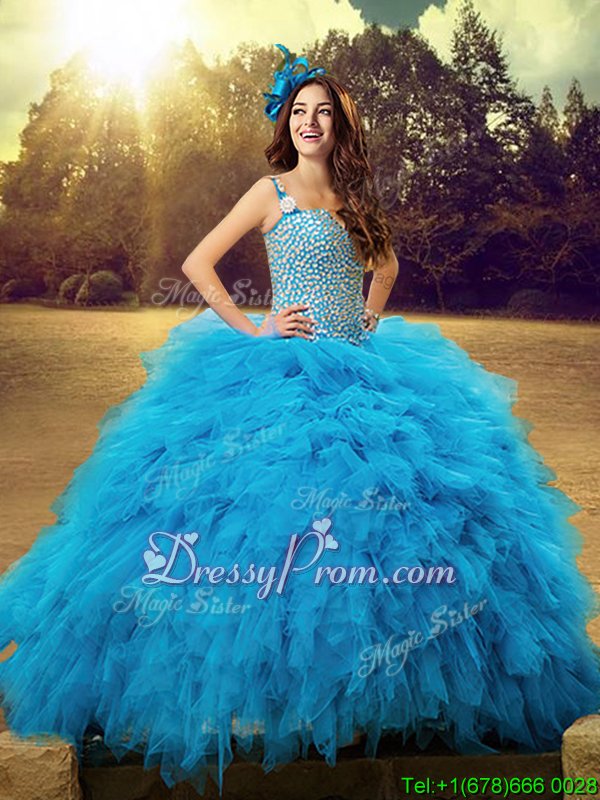 Neckline : StrapsShown Color : Baby BlueSilhouette : Ball GownsSleeve Length : sleevelessHemline : floor lengthBack Detail : Lace upFabric : TulleEmbellishment : Beading,RufflesOccasion : Military Ball,Sweet 16,QuinceaneraSeason : Spring,Summer,Fall,Winter
