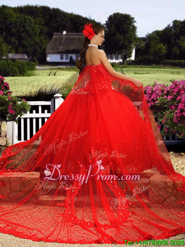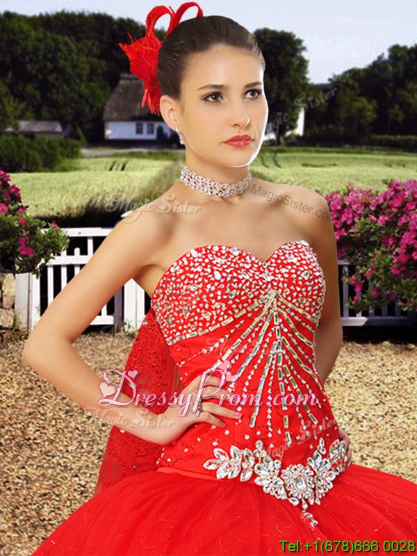 Neckline : SweetheartShown Color : RedSilhouette : Ball GownsSleeve Length : sleevelessHemline : with trainBack Detail : Lace upFabric : TulleEmbellishment : Beading,LaceOccasion : Military Ball,Sweet 16,QuinceaneraSeason : Spring,Summer,Fall,Winter