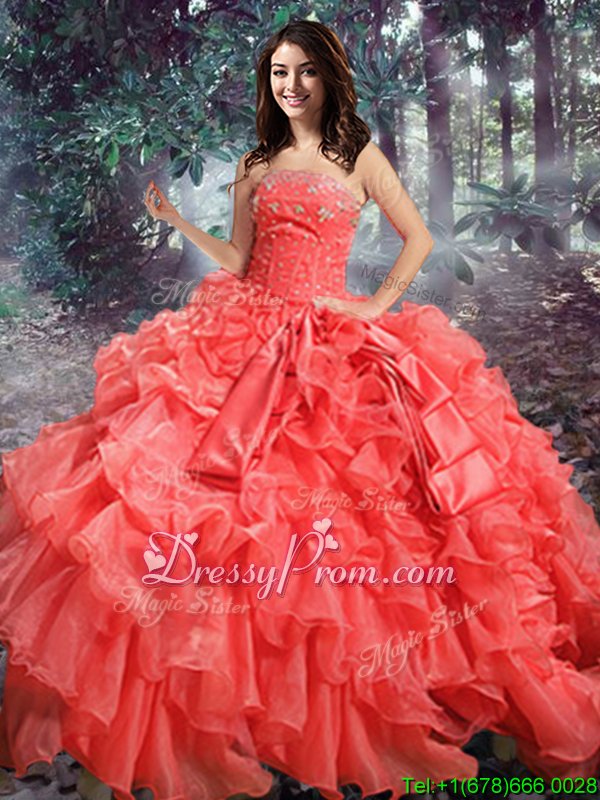Neckline : StraplessShown Color : Coral RedSilhouette : Ball GownsSleeve Length : sleevelessHemline : floor lengthBack Detail : Lace upFabric : OrganzaEmbellishment : Beading,RufflesOccasion : Military Ball,Sweet 16,QuinceaneraSeason : Spring,Summer,Fall,Winter