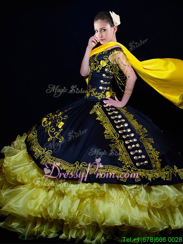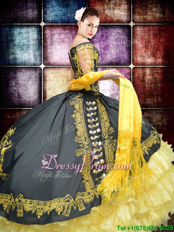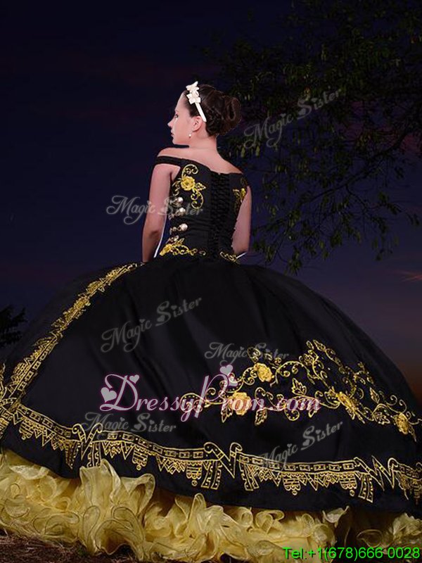 Neckline : Off the shoulderShown Color : Black,YellowSilhouette : Ball GownsSleeve Length : sleevelessHemline : floor lengthBack Detail : Lace upFabric : Organza,TaffetaEmbellishment : Beading,Embroidery,Ruffled LayersOccasion : Military Ball,Sweet 16,QuinceaneraSeason : Spring,Summer,Fall,Winter