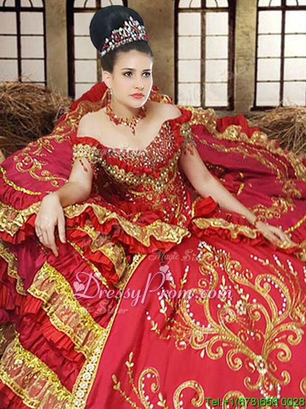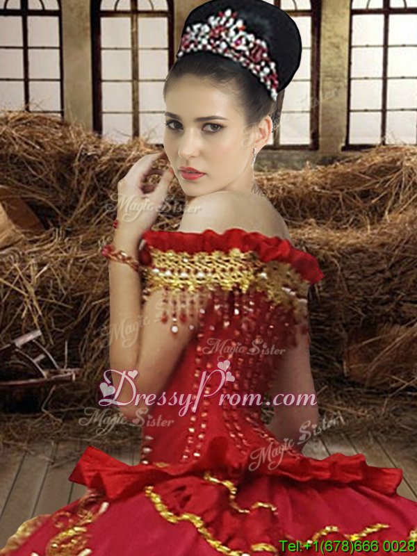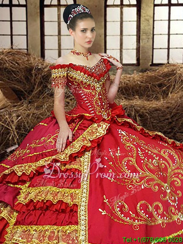 Neckline : Off the shoulderShown Color : RedSilhouette : Ball GownsSleeve Length : sleevelessHemline : floor lengthBack Detail : Lace upFabric : TaffetaEmbellishment : Beading,Embroidery,Ruffled LayersOccasion : Military Ball,Sweet 16,QuinceaneraSeason : Spring,Summer,Fall,Winter