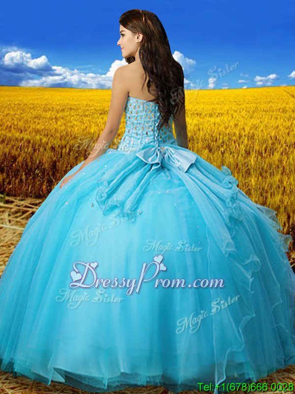 Neckline : StraplessShown Color : Aqua BlueSilhouette : Ball GownsSleeve Length : sleevelessHemline : floor lengthBack Detail : Lace upFabric : TulleEmbellishment : Beading,BowknotOccasion : Military Ball,Sweet 16,QuinceaneraSeason : Spring,Summer,Fall,Winter