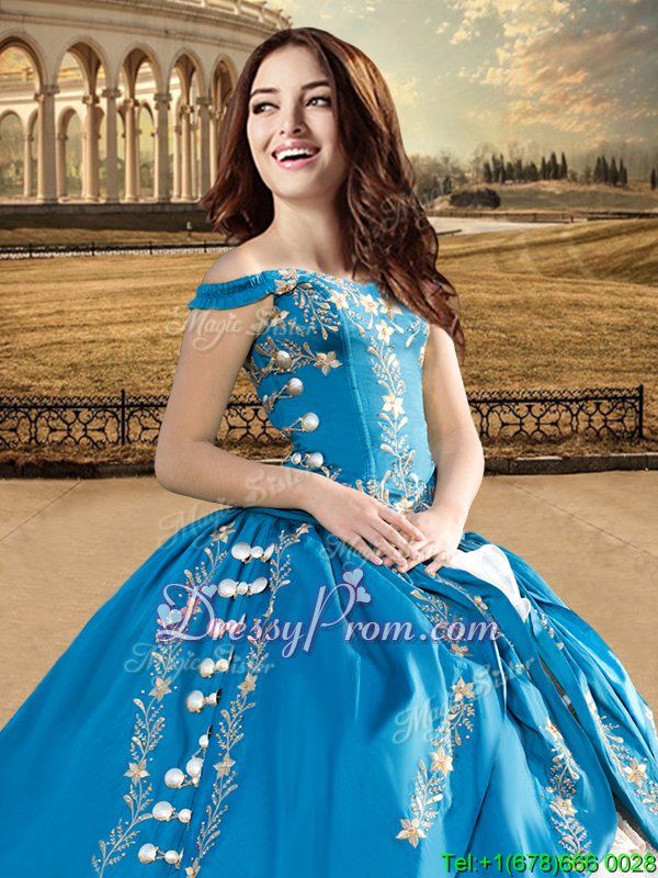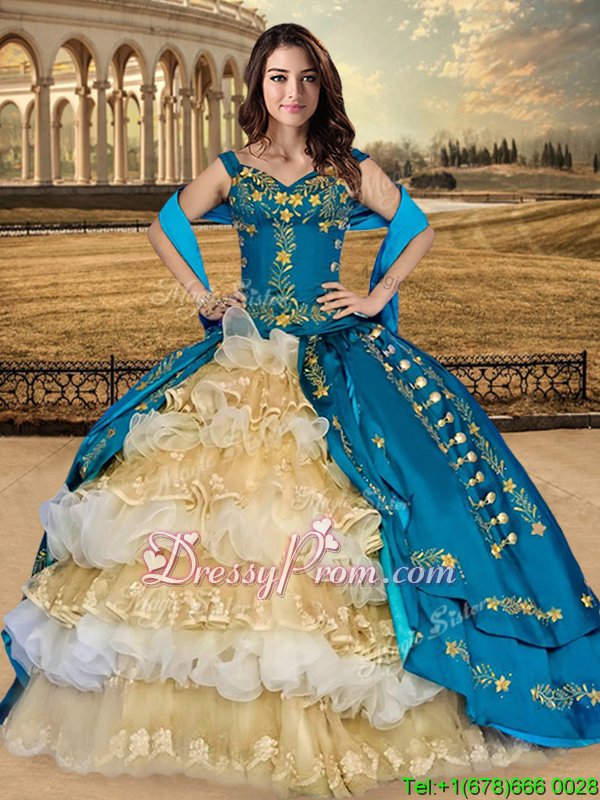 Neckline : Off the shoulderShown Color : ChampagneSilhouette : Ball GownsSleeve Length : sleevelessHemline : floor lengthBack Detail : Lace upFabric : Organza,TaffetaEmbellishment : Appliques,Embroidery,Ruffled LayersOccasion : Military Ball,Sweet 16,QuinceaneraSeason : Spring,Summer,Fall,Winter