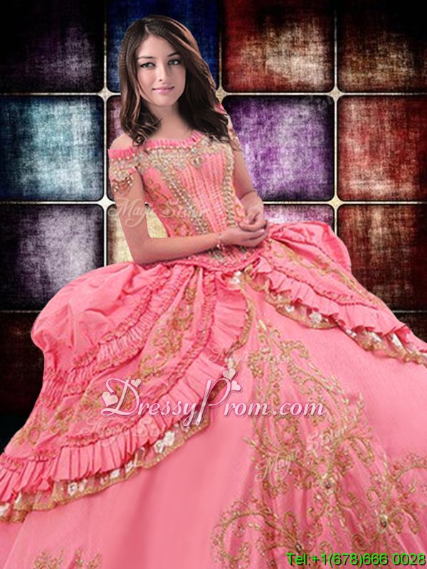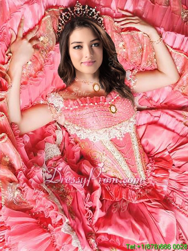Neckline : Off the shoulderShown Color : Watermelon RedSilhouette : Ball GownsSleeve Length : sleevelessHemline : floor lengthBack Detail : Lace upFabric : TaffetaEmbellishment : Beading,Embroidery,Ruffled LayersOccasion : Military Ball,Sweet 16,QuinceaneraSeason : Spring,Summer,Fall,Winter