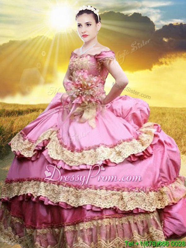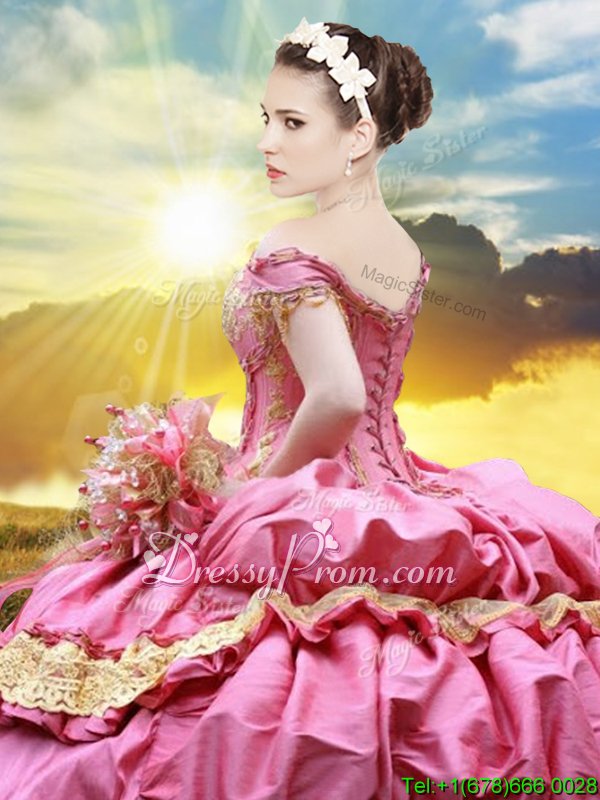 Neckline : Off the shoulderShown Color : Rose Pink Silhouette : Ball GownsSleeve Length : sleevelessHemline : floor lengthBack Detail : Lace upFabric : TaffetaEmbellishment : Lace,Appliques,Pick UpsOccasion : Military Ball,Sweet 16,QuinceaneraSeason : Spring,Summer,Fall,Winter