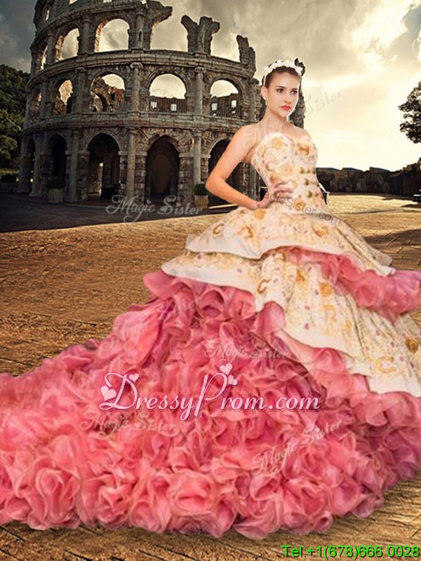 Top Selling White and Pink And White Organza Lace Up Sweetheart Sleeveless With Train Quinceanera Dress Court Train Embroidery and Ruffles
