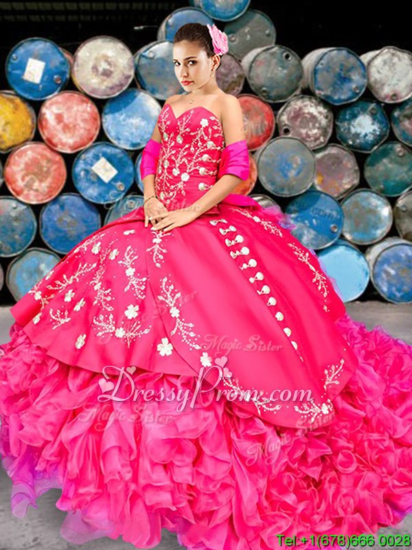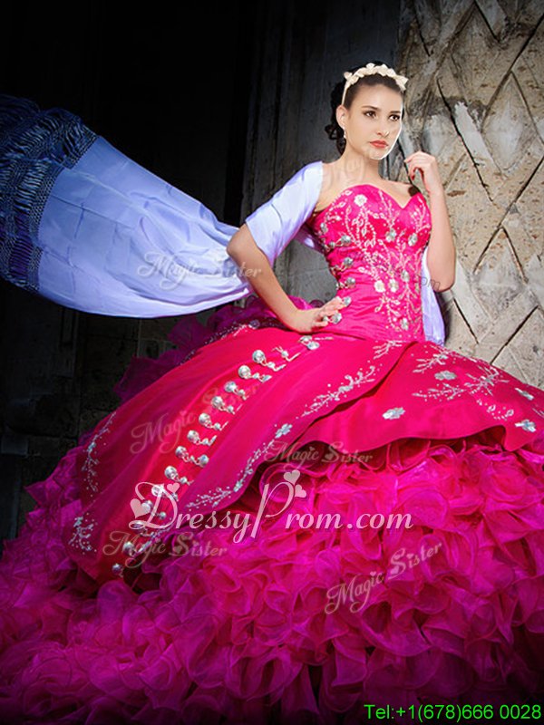 Neckline : Sweetheart Shown Color : Hot Pink Silhouette : Ball Gowns Sleeve Length : sleeveless Hemline : with train Back Detail : Lace up Fabric : Organza,Taffeta Embellishment : Beading,Embroidery,Ruffles Occasion : Military Ball,Sweet 16,Quinceanera Season : Spring,Summer,Fall,Winter