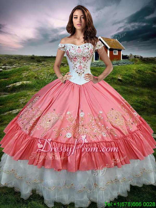 Neckline : Off the shoulderShown Color : Watermelon RedSilhouette : Ball GownsSleeve Length : sleevelessHemline : floor lengthBack Detail : Lace upFabric : Organza,TaffetaEmbellishment : Embroidery,Ruffled LayersOccasion : Military Ball,Sweet 16,QuinceaneraSeason : Spring,Summer,Fall,Winter