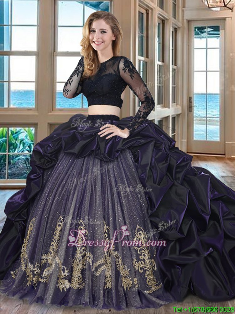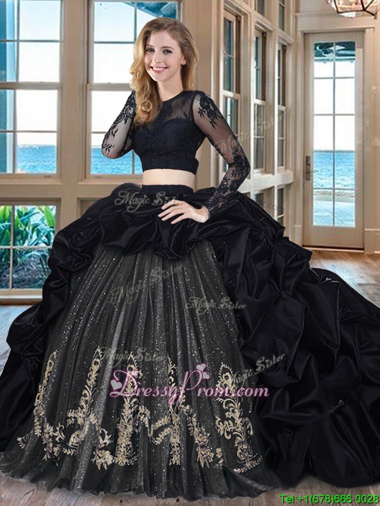 Neckline : Scoop Shown Color : Black Silhouette : Two Pieces Sleeve Length : long sleeves Hemline : with train Back Detail : Backless Fabric : Taffeta Embellishment : Embroidery,Pick Ups Occasion : Military Ball,Sweet 16,Quinceanera Season : Spring,Summer,Fall,Winter
