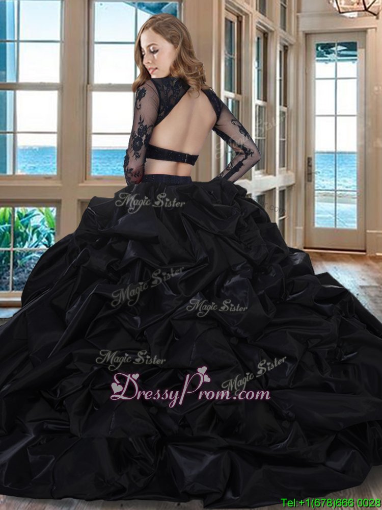 Fancy Black Taffeta Backless Scoop Long Sleeves With Train Ball Gown Prom Dress Brush Train Embroidery and Pick Ups