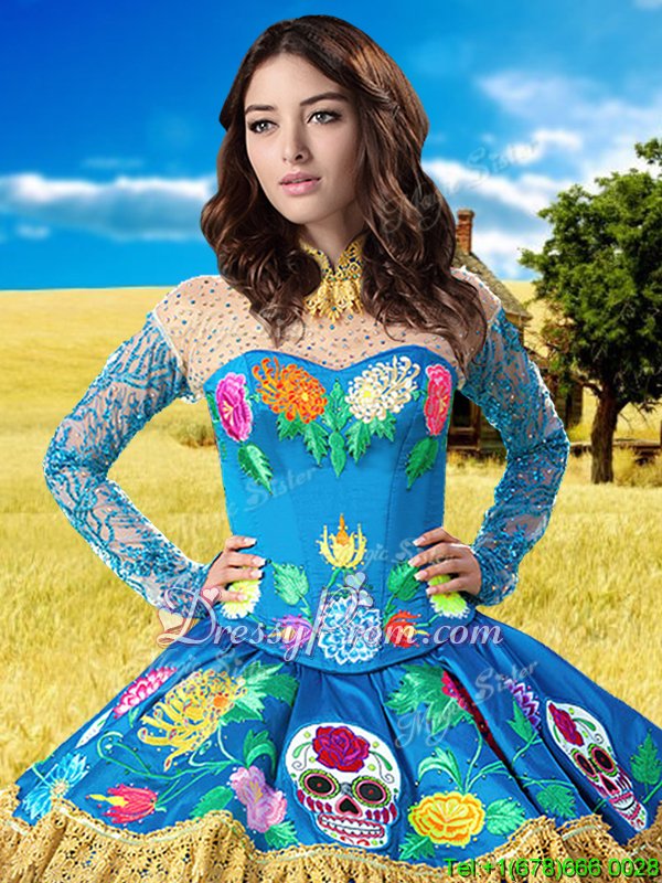 Neckline : High-neckShown Color : BlueSilhouette : Ball GownsSleeve Length : long sleevesHemline : floor lengthBack Detail : Lace upFabric : TaffetaEmbellishment : Lace,EmbroideryOccasion : Military Ball,Sweet 16,QuinceaneraSeason : Spring,Summer,Fall,Winter