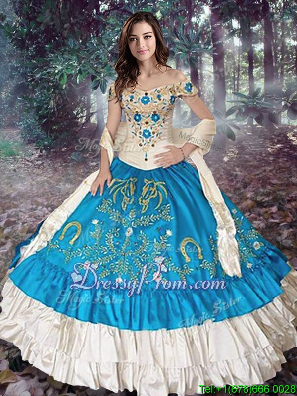 Neckline : Off the shoulder Shown Color : Teal Silhouette : Ball Gowns Sleeve Length : cap sleeves Back Detail : Lace up Fabric : Taffeta Embellishment : Embroidery,Ruffled Layers Occasion : Military Ball,Sweet 16,Quinceanera Season : Spring,Summer,Fall,Winter
