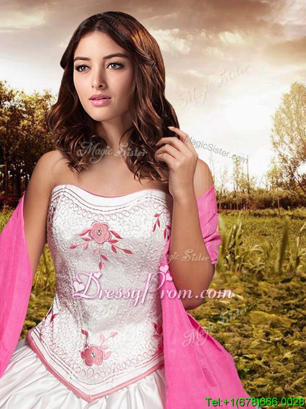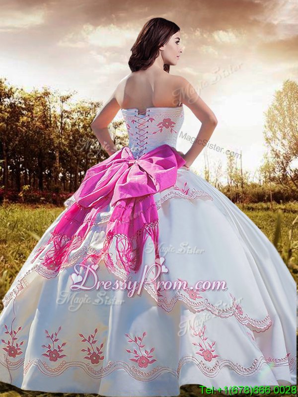Neckline : StraplessShown Color : WhiteSilhouette : Ball GownsSleeve Length : sleevelessHemline : floor lengthBack Detail : Lace upFabric : TaffetaEmbellishment : Embroidery,BowknotOccasion : Military Ball,Sweet 16,QuinceaneraSeason : Spring,Summer,Fall,Winter