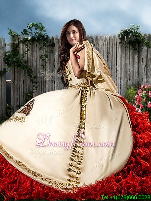 Neckline : Sweetheart Shown Color : White And Red Silhouette : Ball Gowns Sleeve Length : sleeveless Hemline : with train Back Detail : Lace up Fabric : Organza,Taffeta Embellishment : Beading,Embroidery,Ruffles Occasion : Military Ball,Sweet 16,Quinceanera Season : Spring,Summer,Fall,Winter