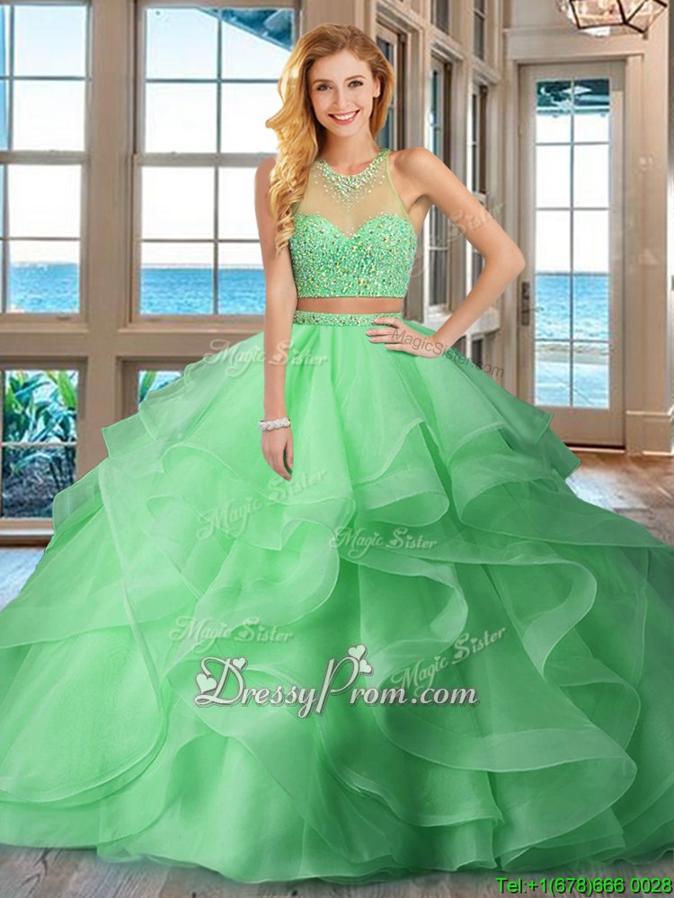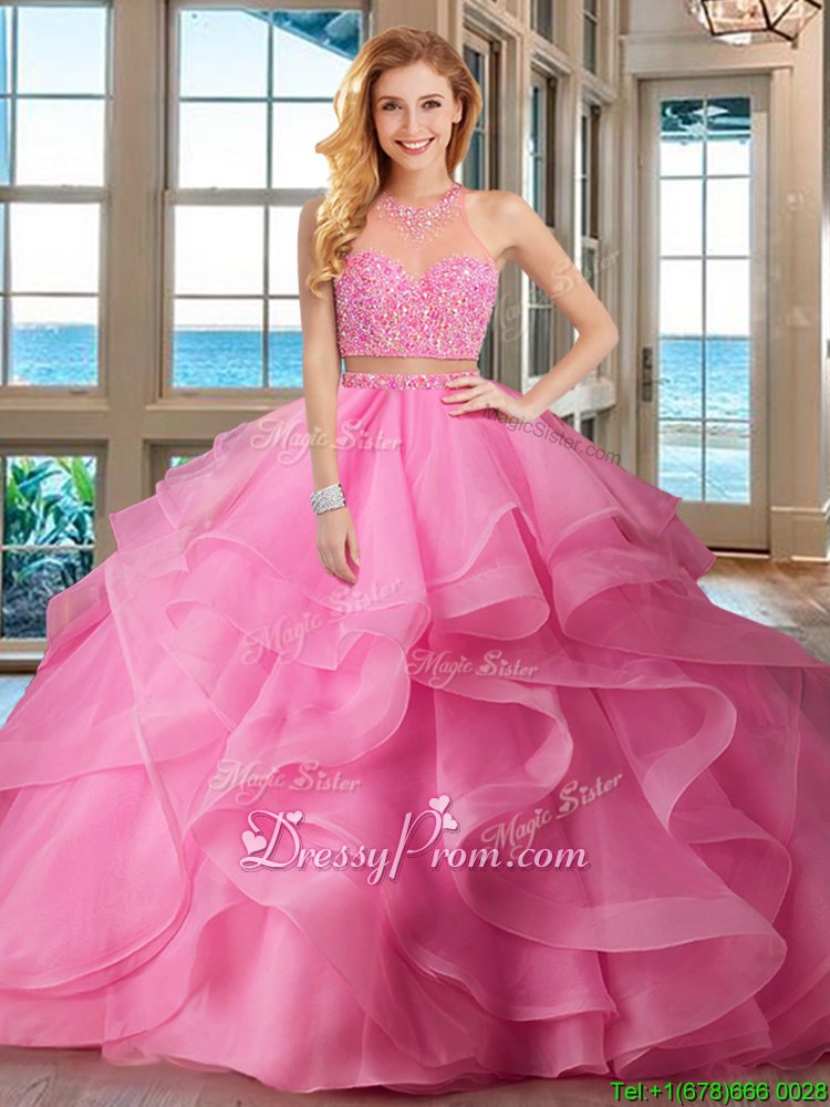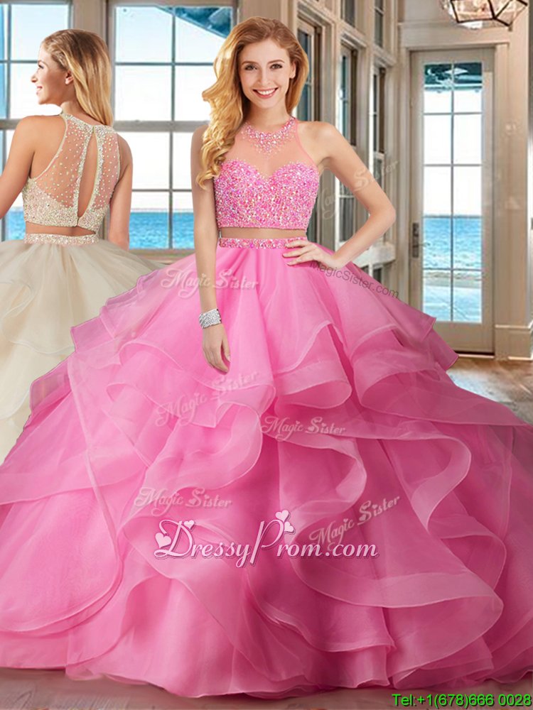 Neckline : High-neckShown Color : Baby PinkSilhouette : Two PiecesSleeve Length : sleevelessHemline : with trainBack Detail : Lace upFabric : OrganzaEmbellishment : Beading,RufflesOccasion : Military Ball,Sweet 16,QuinceaneraSeason : Spring,Summer,Fall,Winter