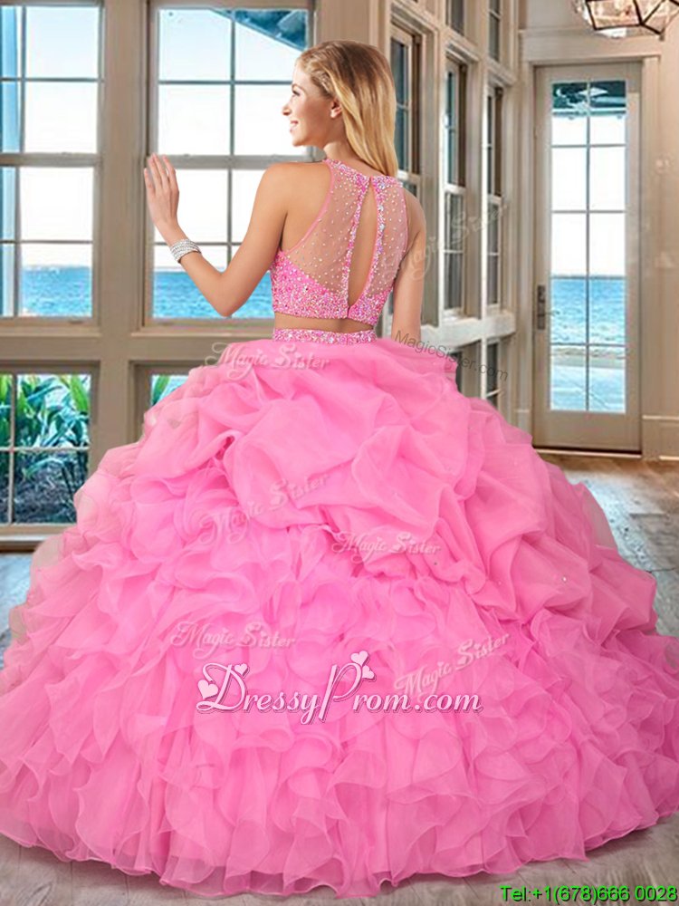 Neckline : High-neck Shown Color : Apple Green Silhouette : Two Pieces Sleeve Length : sleeveless Hemline : floor length Back Detail : Lace up Fabric : Organza Embellishment : Beading,Ruffles Occasion : Military Ball,Sweet 16,Quinceanera Season : Spring,Summer,Fall,Winter