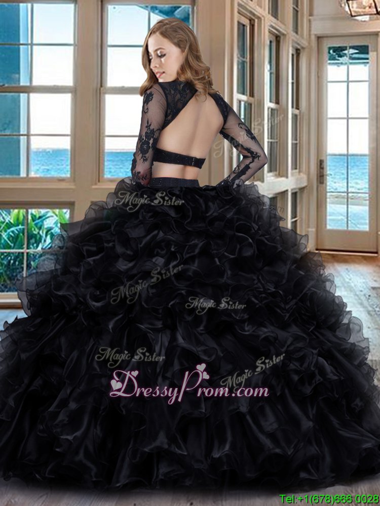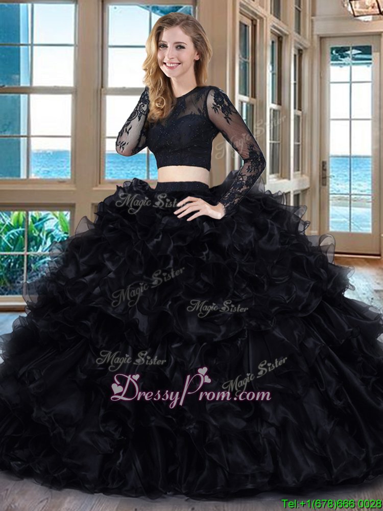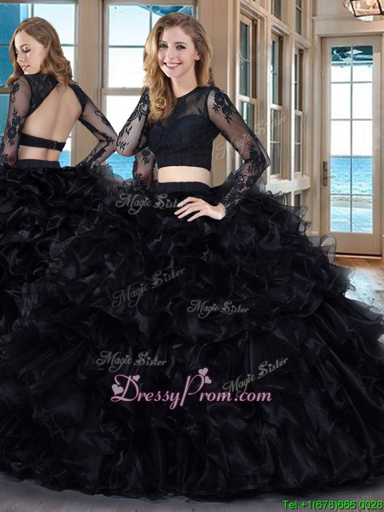 Neckline : ScoopShown Color : BlackSilhouette : Two PiecesSleeve Length : long sleevesHemline : floor lengthBack Detail : BacklessFabric : OrganzaEmbellishment : RufflesOccasion : Military Ball,Sweet 16,QuinceaneraSeason : Spring,Summer,Fall,Winter