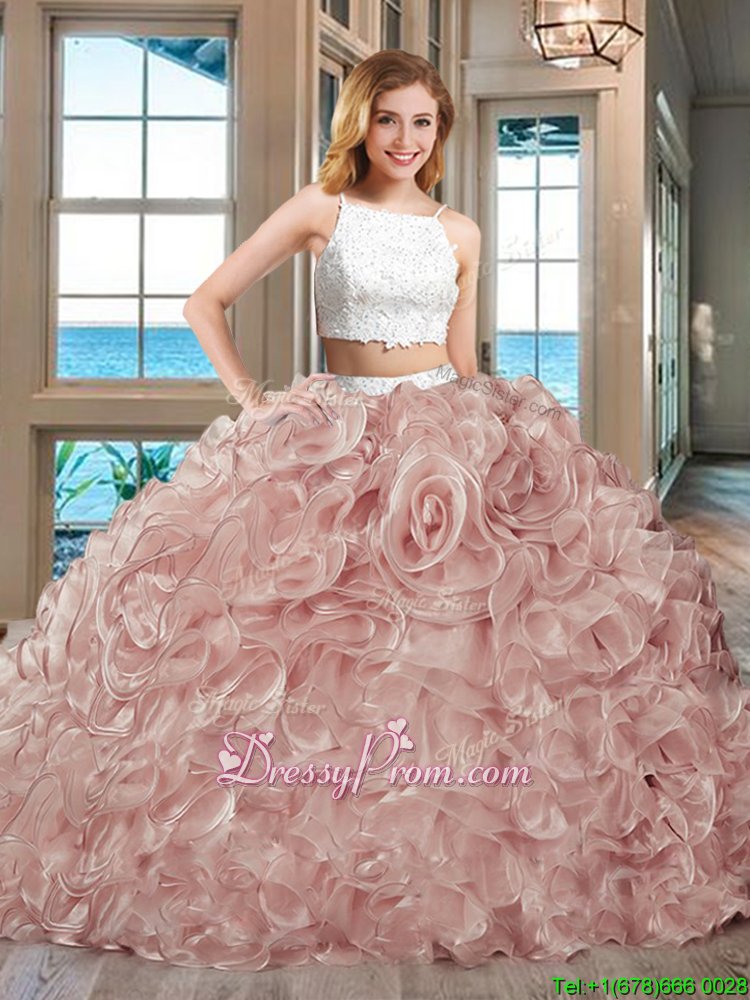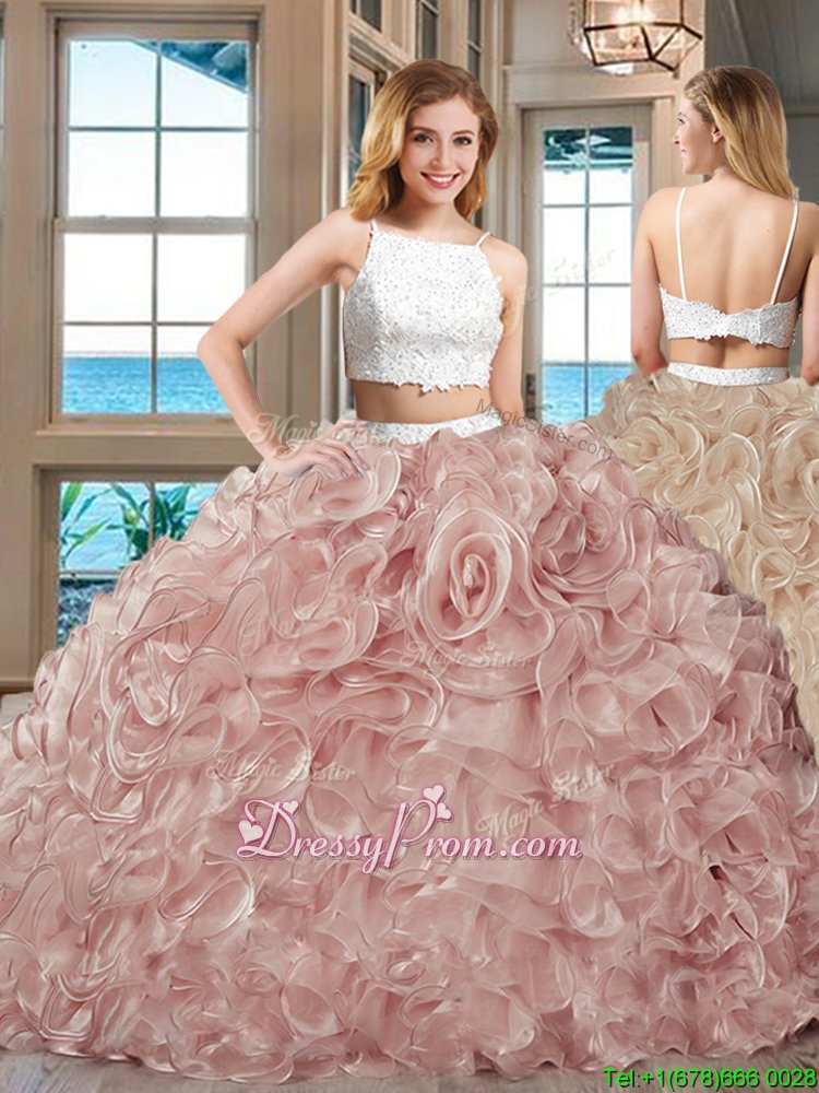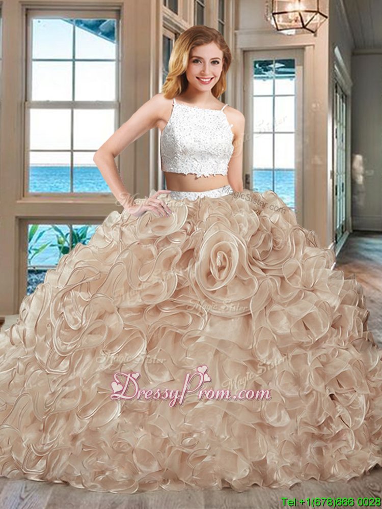 Neckline : StrapsShown Color : WhiteSilhouette : Two PiecesSleeve Length : sleevelessHemline : floor lengthBack Detail : BacklessFabric : TulleEmbellishment : Beading,RufflesOccasion : Military Ball,Sweet 16,QuinceaneraSeason : Spring,Summer,Fall,Winter