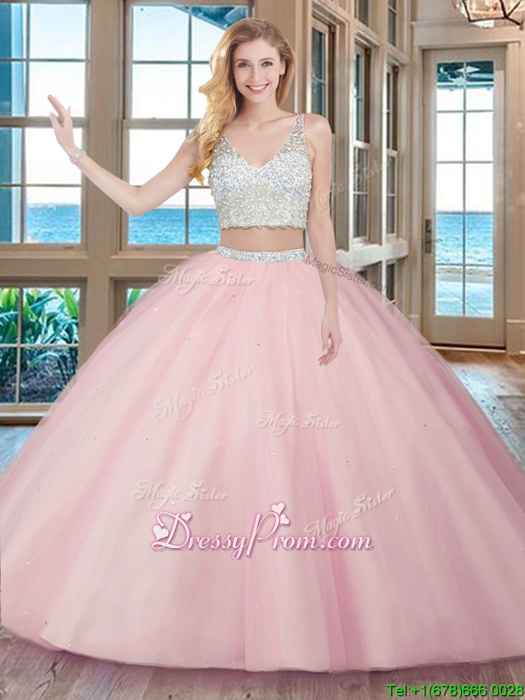 Neckline : V-neck Shown Color : Aqua Blue Silhouette : Two Pieces Sleeve Length : sleeveless Hemline : with train Back Detail : Zipper Fabric : Tulle Embellishment : Beading Occasion : Military Ball,Sweet 16,Quinceanera Season : Spring,Summer,Fall,Winter