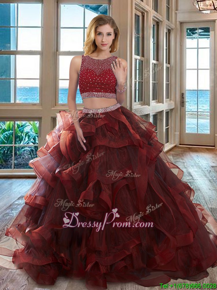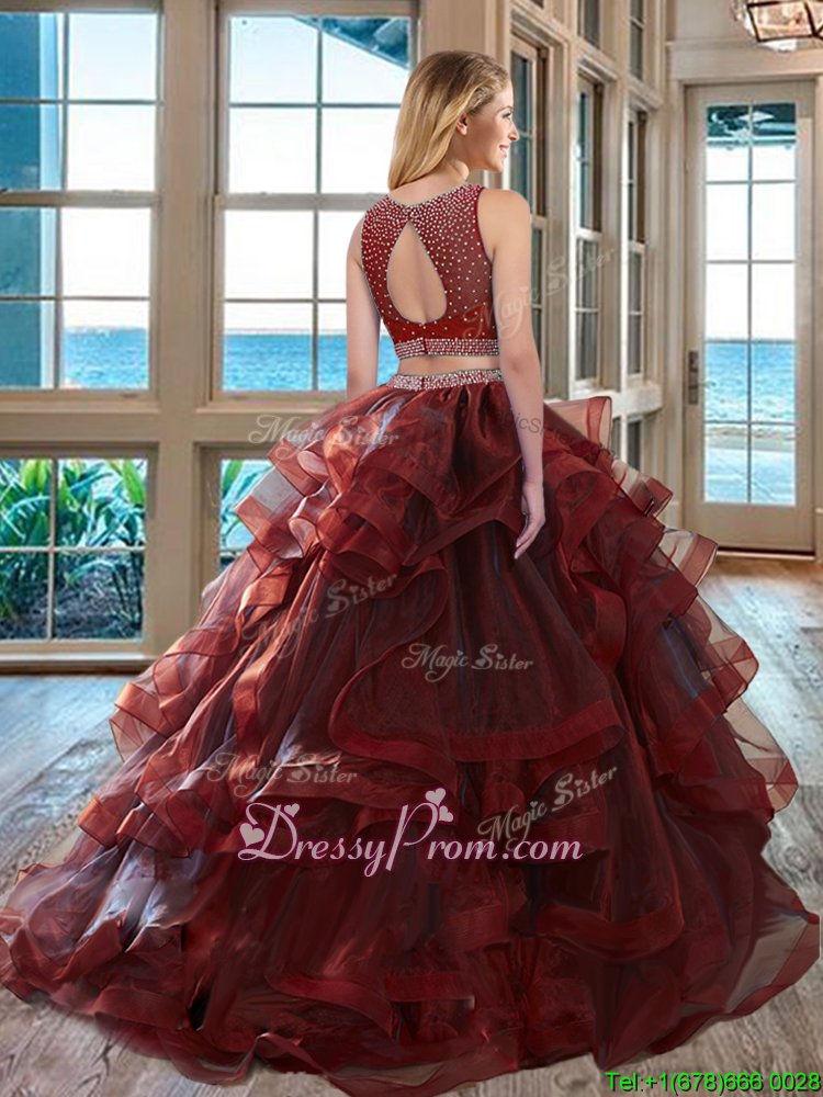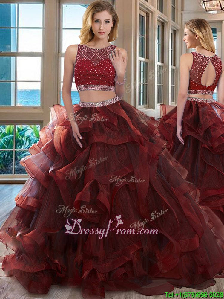 Neckline : ScoopShown Color : BurgundySilhouette : Two PiecesSleeve Length : sleevelessHemline : floor lengthBack Detail : BacklessFabric : OrganzaEmbellishment : BeadingOccasion : Military Ball,Sweet 16,QuinceaneraSeason : Spring,Summer,Fall,Winter