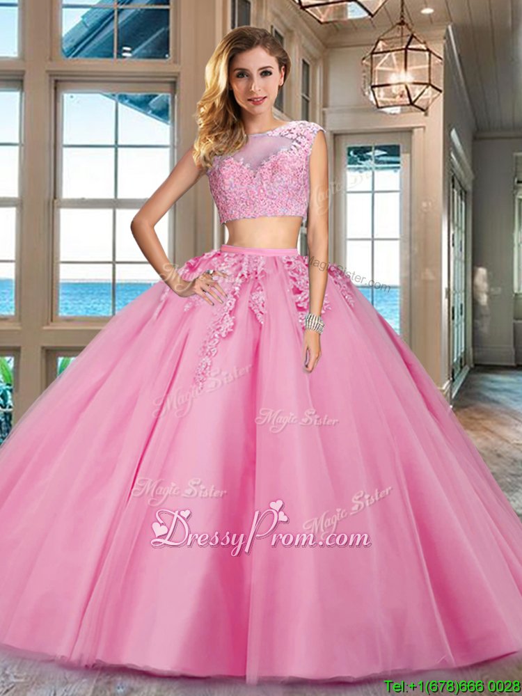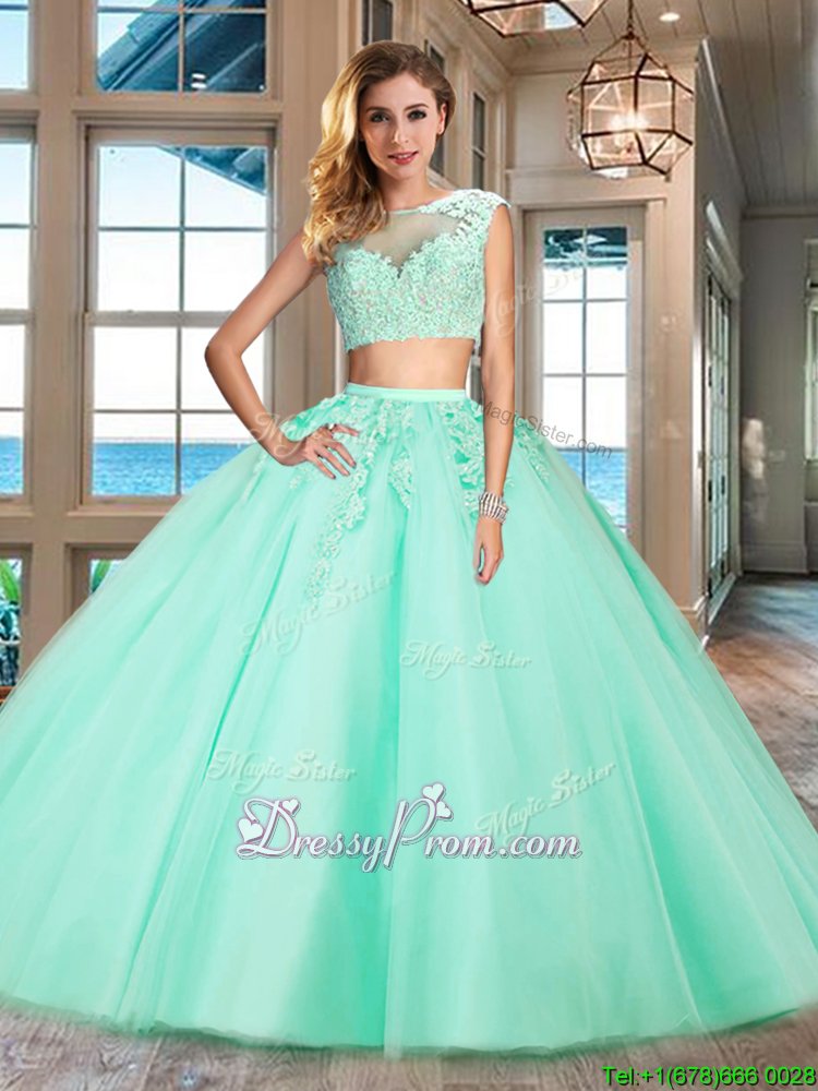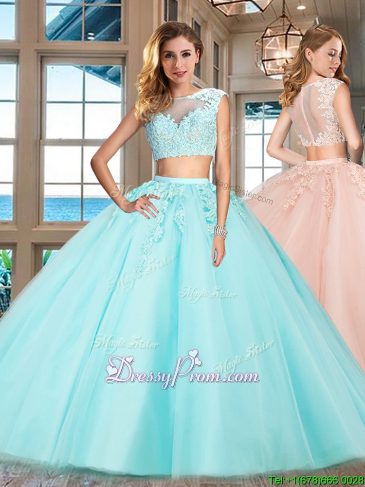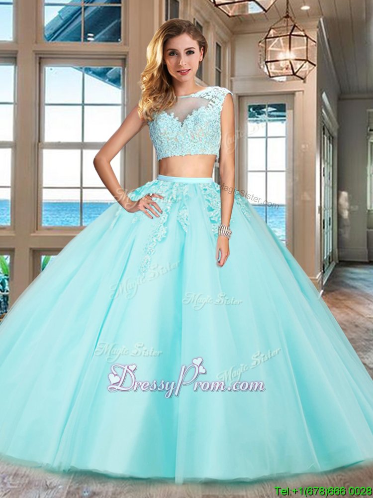Neckline : Bateau Shown Color : Aqua Blue Silhouette : Two Pieces Sleeve Length : cap sleeves Hemline : floor length Back Detail : Zipper Fabric : Tulle Embellishment : Appliques Occasion : Military Ball,Sweet 16,Quinceanera Season : Spring,Summer,Fall,Winter