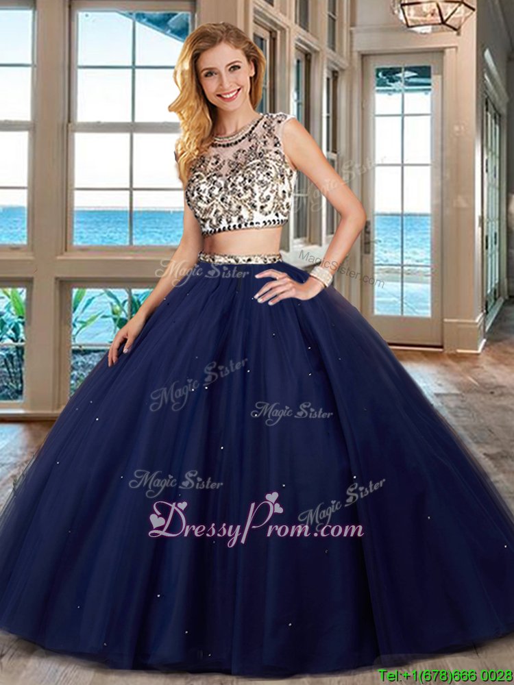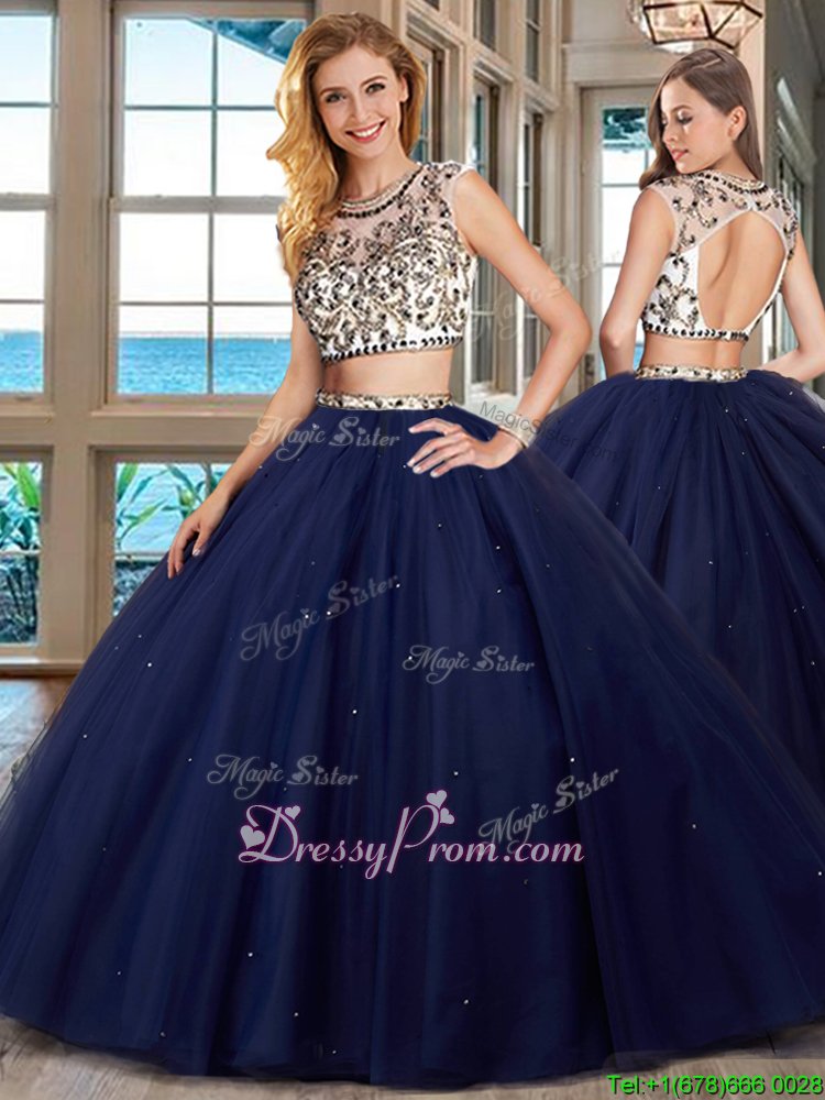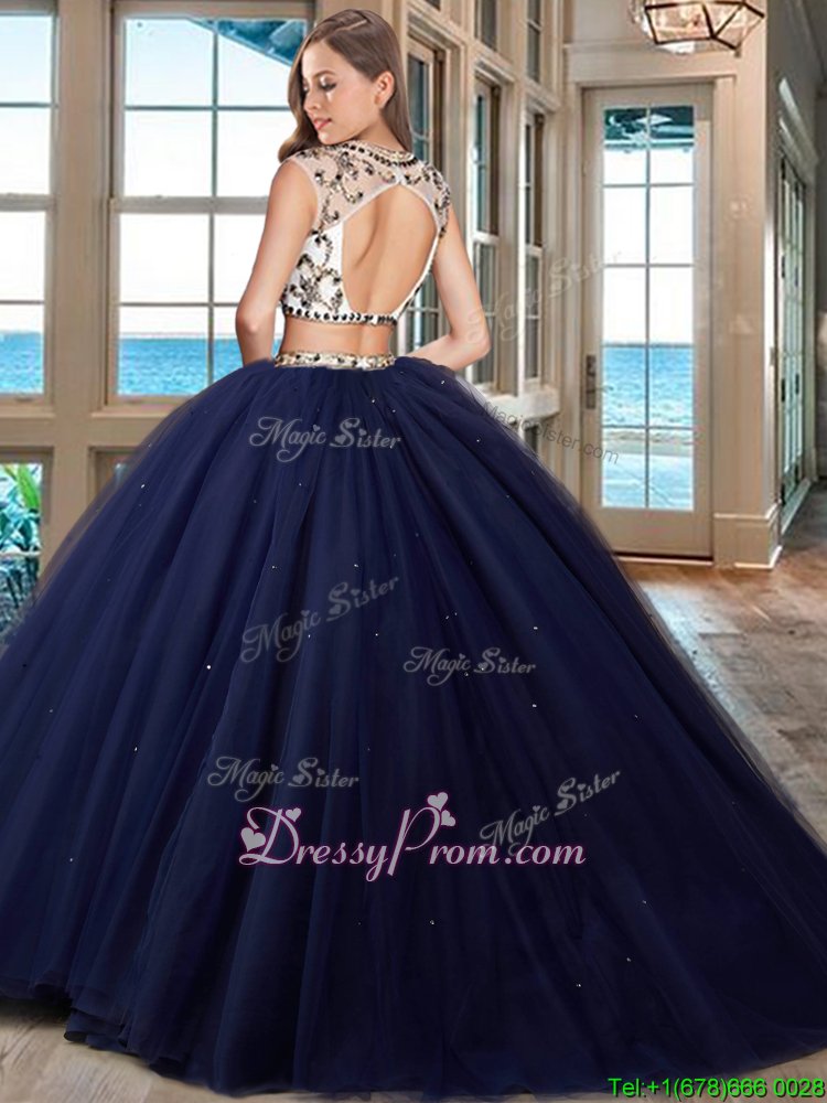 Neckline : Scoop Shown Color : Navy Blue Silhouette : Two Pieces Sleeve Length : cap sleeves Hemline : with train Back Detail : Backless Fabric : Tulle Embellishment : Beading Occasion : Military Ball,Sweet 16,Quinceanera Season : Spring,Summer,Fall,Winter