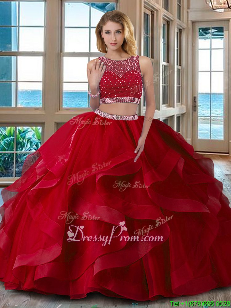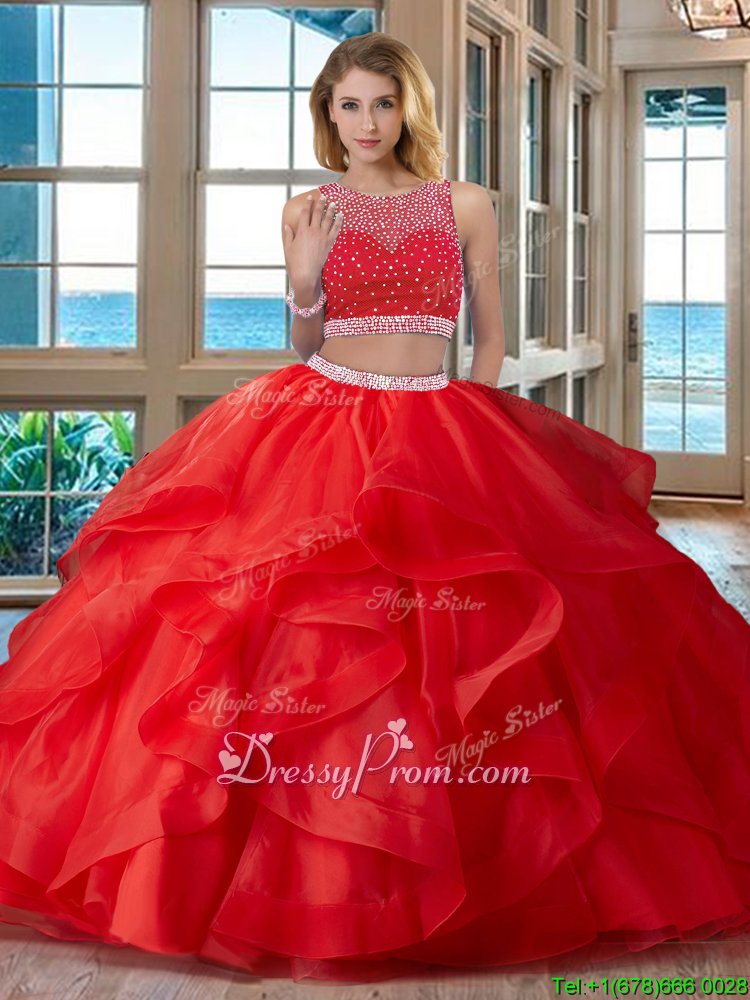 Neckline : ScoopShown Color : RedSilhouette : Two PiecesSleeve Length : sleevelessHemline : floor lengthBack Detail : ZipperFabric : OrganzaEmbellishment : BeadingOccasion : Military Ball,Sweet 16,QuinceaneraSeason : Spring,Summer,Fall,Winter