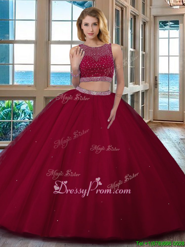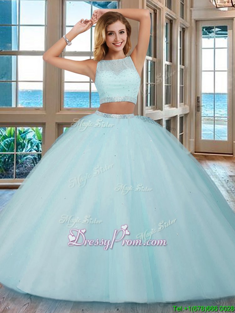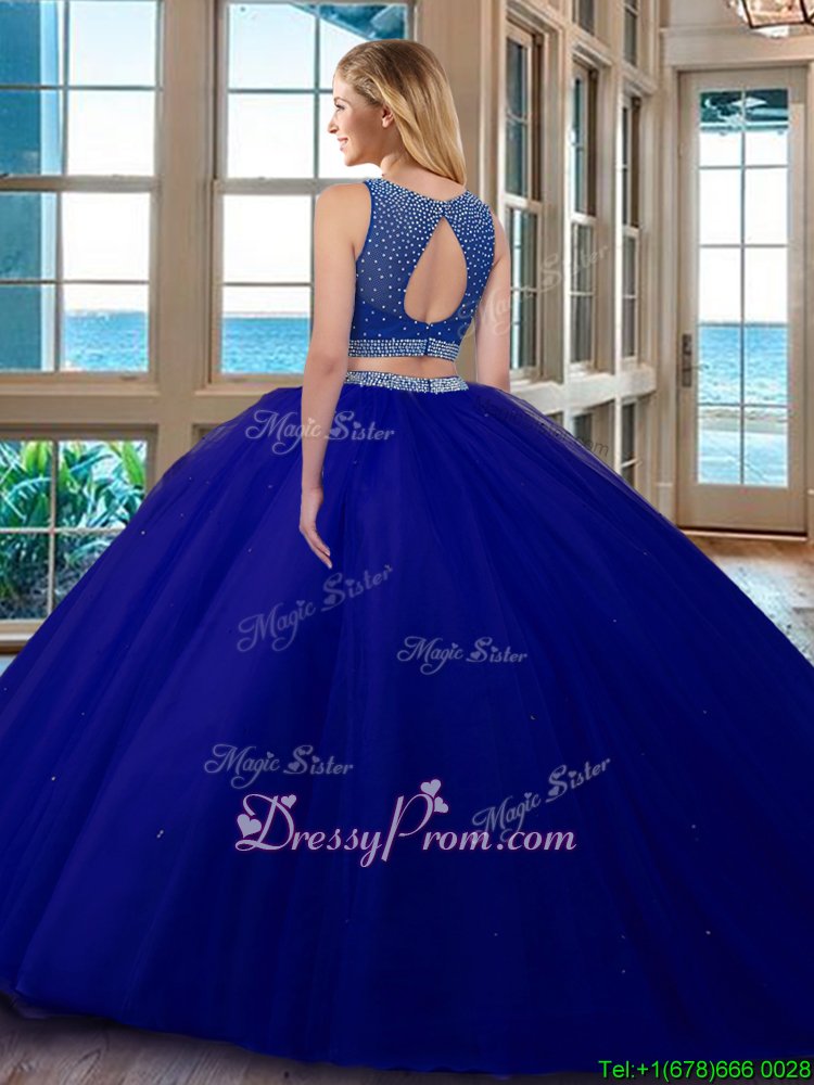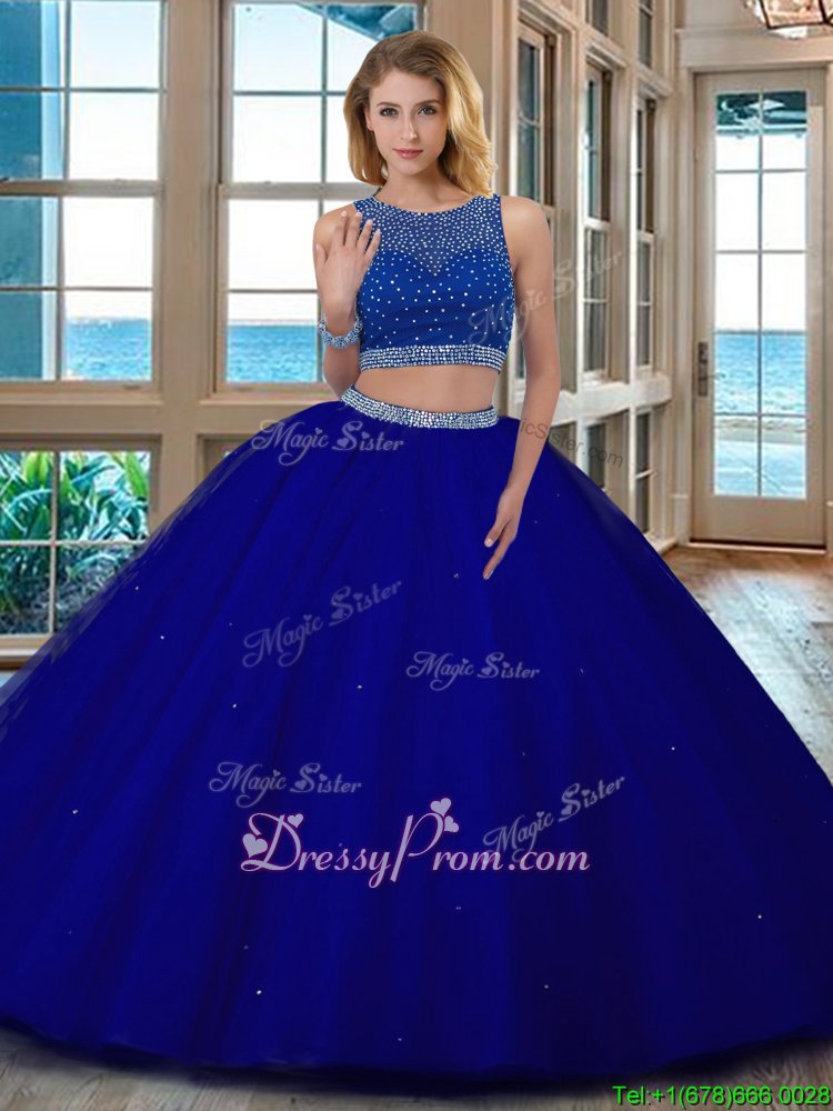 Neckline : ScoopShown Color : Royal BlueSilhouette : Two PiecesSleeve Length : sleevelessHemline : floor lengthBack Detail : BacklessFabric : TulleEmbellishment : BeadingOccasion : Military Ball,Sweet 16,QuinceaneraSeason : Spring,Summer,Fall,Winter