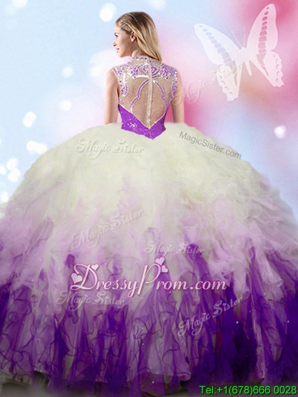 Neckline : High-neckShown Color : White And PurpleSilhouette : Ball GownsSleeve Length : sleevelessHemline : floor lengthBack Detail : ZipperFabric : TulleEmbellishment : Beading,RufflesOccasion : Military Ball,Sweet 16,QuinceaneraSeason : Spring,Summer,Fall,Winter