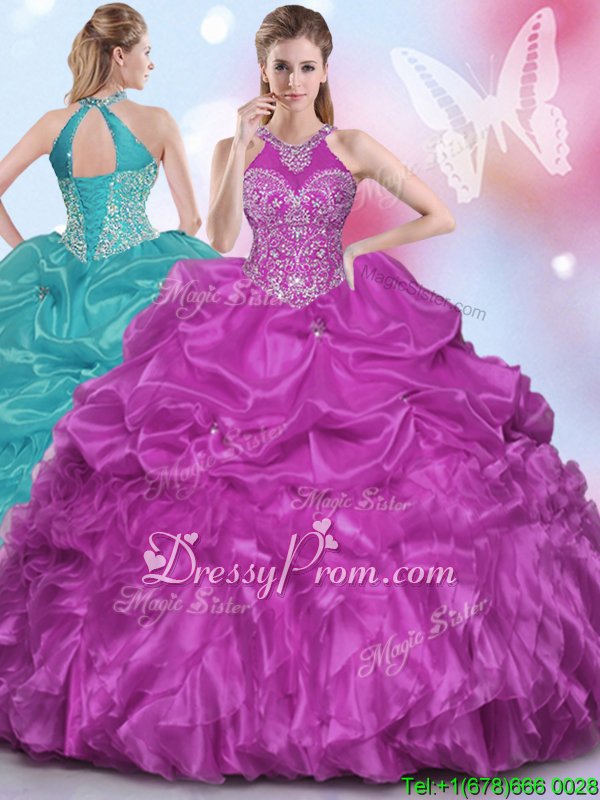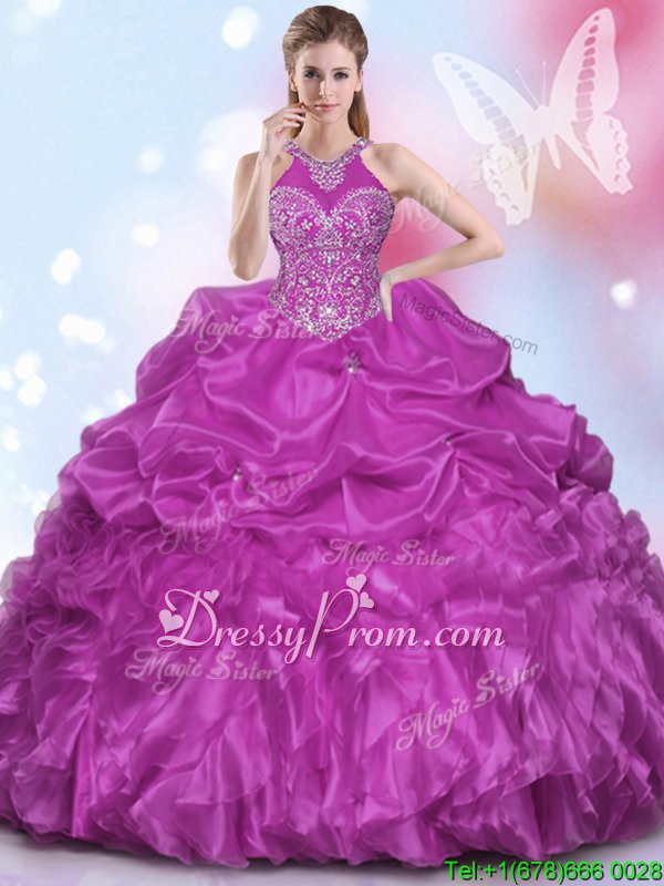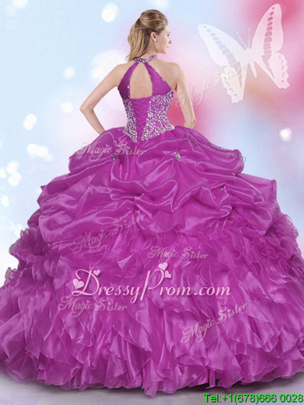 Neckline : Halter topShown Color : FuchsiaSilhouette : Ball GownsSleeve Length : sleevelessHemline : floor lengthBack Detail : Lace upFabric : OrganzaEmbellishment : Appliques,Pick UpsOccasion : Military Ball,Sweet 16,QuinceaneraSeason : Spring,Summer,Fall,Winter