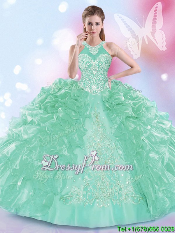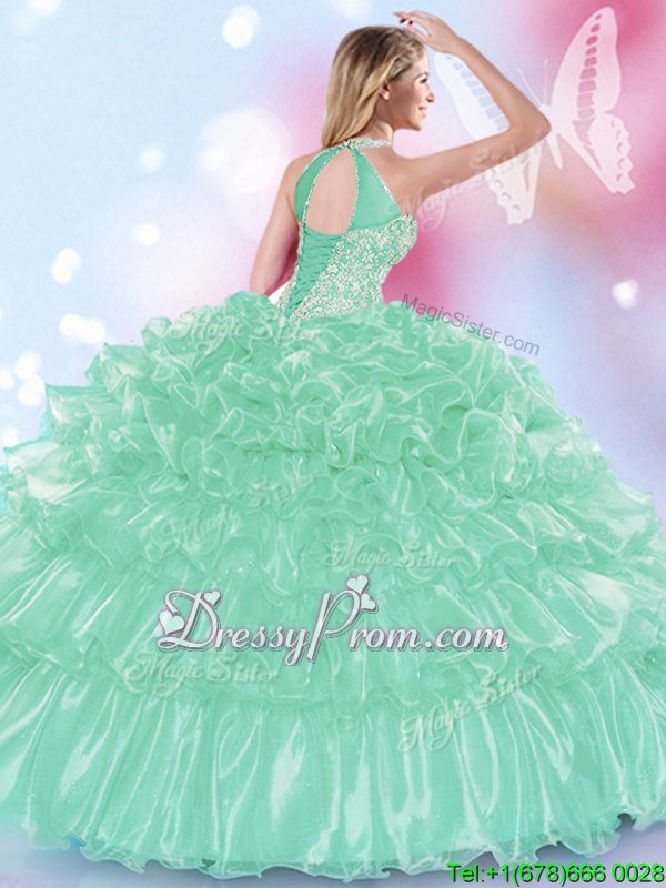 Neckline : Halter top Shown Color : Apple Green Silhouette : Ball Gowns Sleeve Length : sleeveless Hemline : floor length Back Detail : Lace up Fabric : Organza Embellishment : Appliques,Ruffles Occasion : Military Ball,Sweet 16,Quinceanera Season : Spring,Summer,Fall,Winter