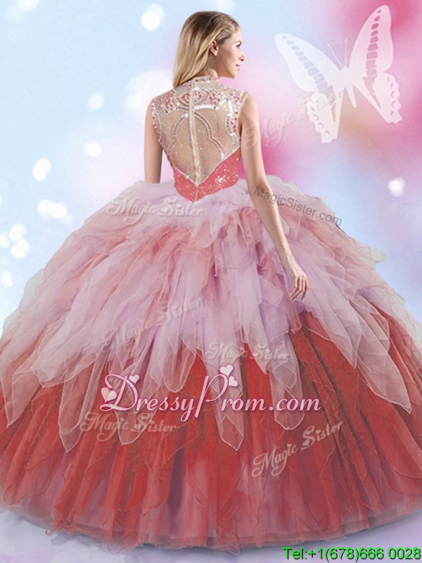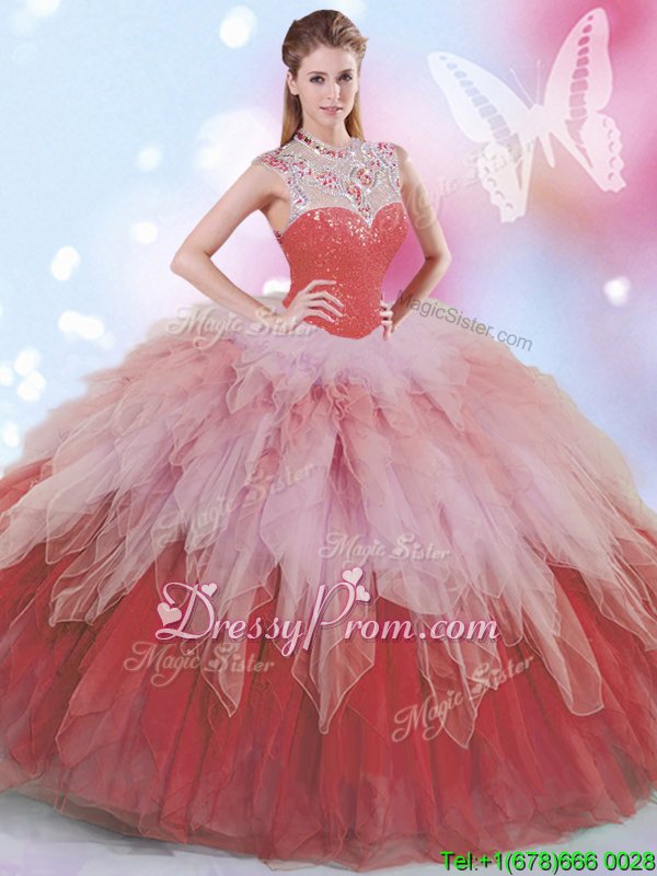 Neckline : High-neckShown Color : Multi-colorSilhouette : Ball GownsSleeve Length : sleevelessHemline : floor lengthBack Detail : ZipperFabric : TulleEmbellishment : Beading,RufflesOccasion : Military Ball,Sweet 16,QuinceaneraSeason : Spring,Summer,Fall,Winter