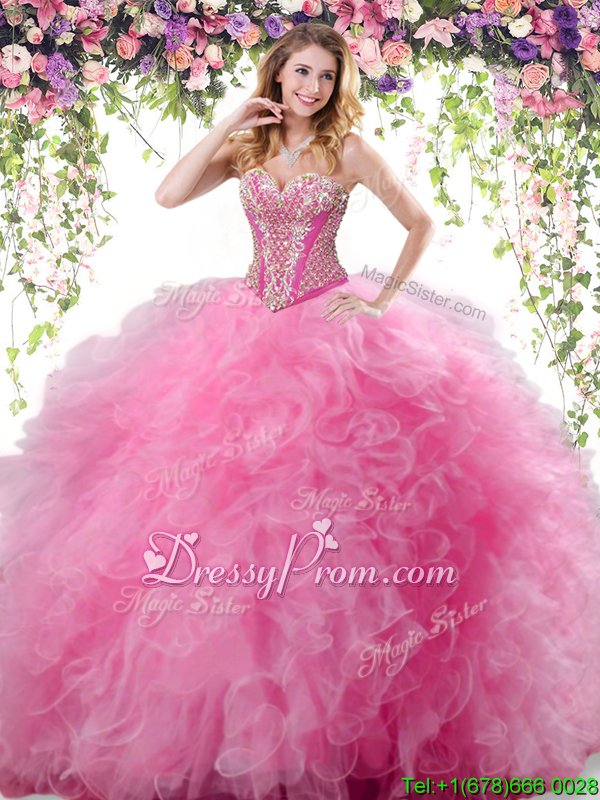 Neckline : SweetheartShown Color : Rose Pink Silhouette : Ball GownsSleeve Length : sleevelessHemline : floor lengthBack Detail : Lace upFabric : TulleEmbellishment : Beading,RufflesOccasion : Military Ball,Sweet 16,QuinceaneraSeason : Spring,Summer,Fall,Winter